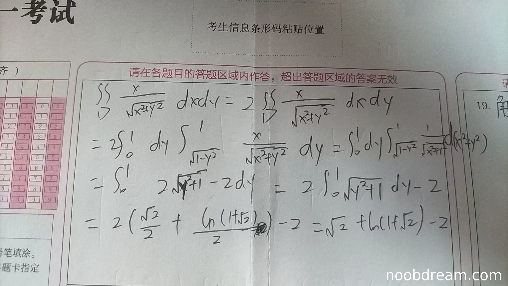 关于第一次识别结果: 第一次识别结果中存在明显的笔误或识别错误,例如积分限写错、微分符号错误(\(d(\ln(x^2+y^2))\))。但根据“禁止扣分”规则第3条,只要有一次识别正确则不扣分。第二次识别结果是完整且正确的。