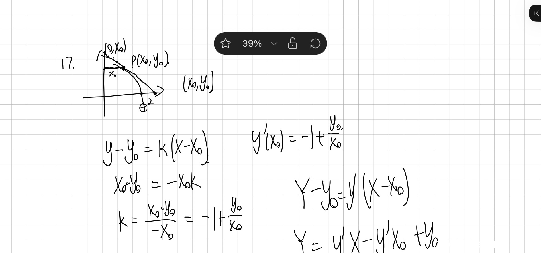 学生作答仅给出了推导切线方程和斜率关系的过程,并得到了导数表达式 \(y'(x_0) = -1 + \frac{y_0}{x_0}\),这等价于微分方程 \(y' - \frac{1}{x}y = -1\)。然而,学生没有继续求解这个微分方程,也没有利用初始条件 \(y(e^2)=0\) 确定特解。因此,解题过程不完整,只完成了建立方程的部分。根据题目分值分配(第一问通常占5分),扣去未完成部分的分数,给予 2分。