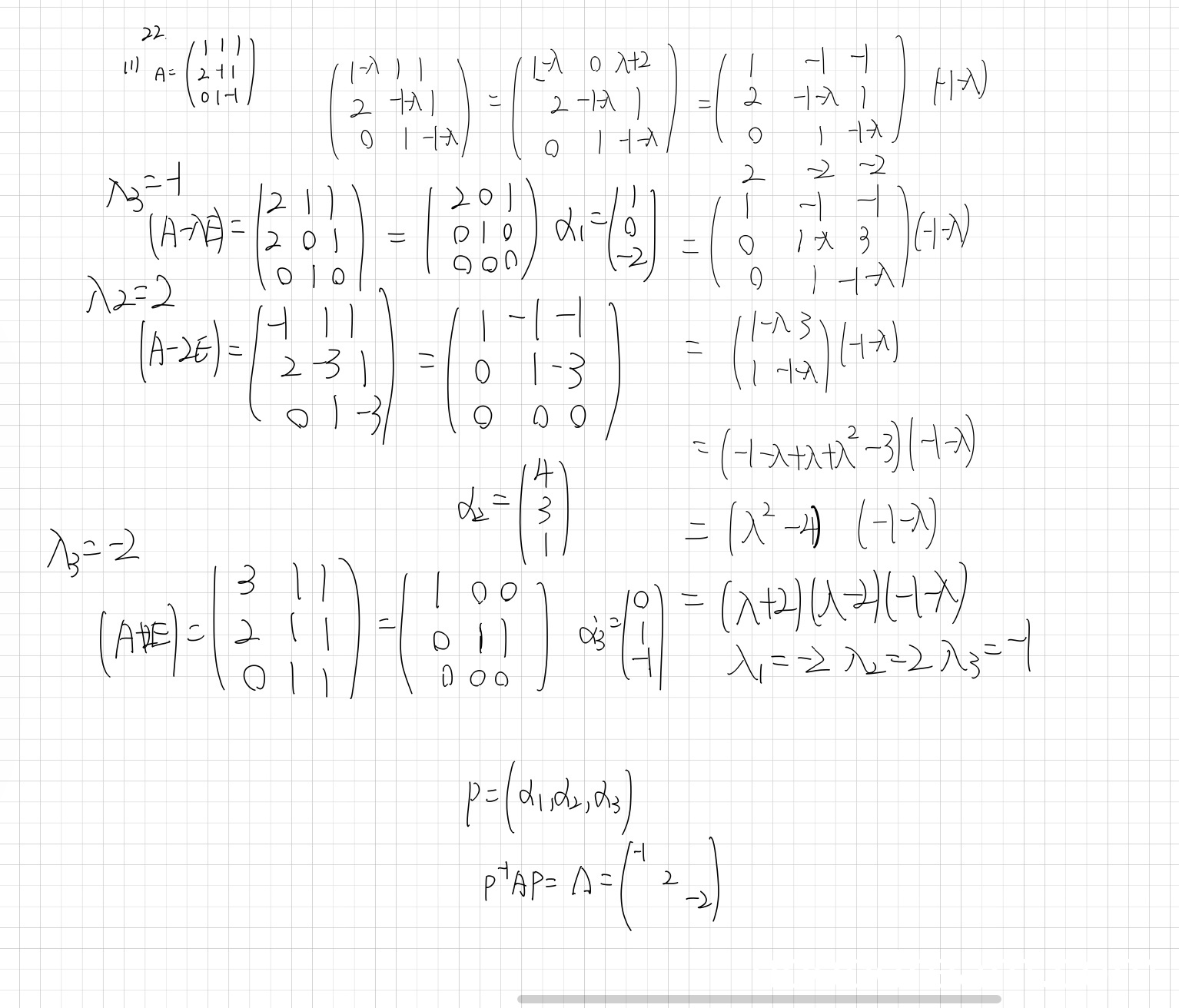 本题第(2)问要求求可逆矩阵P和对角矩阵Λ。虽然学生在第(1)问中写错了矩阵A,但第(2)问的求解过程是基于其自己给出的错误矩阵进行的。评分应基于其第(2)问的求解逻辑是否正确,以及最终得到的P和Λ是否满足 \(P^{-1}AP = Λ\) 且A为其自己给出的矩阵。