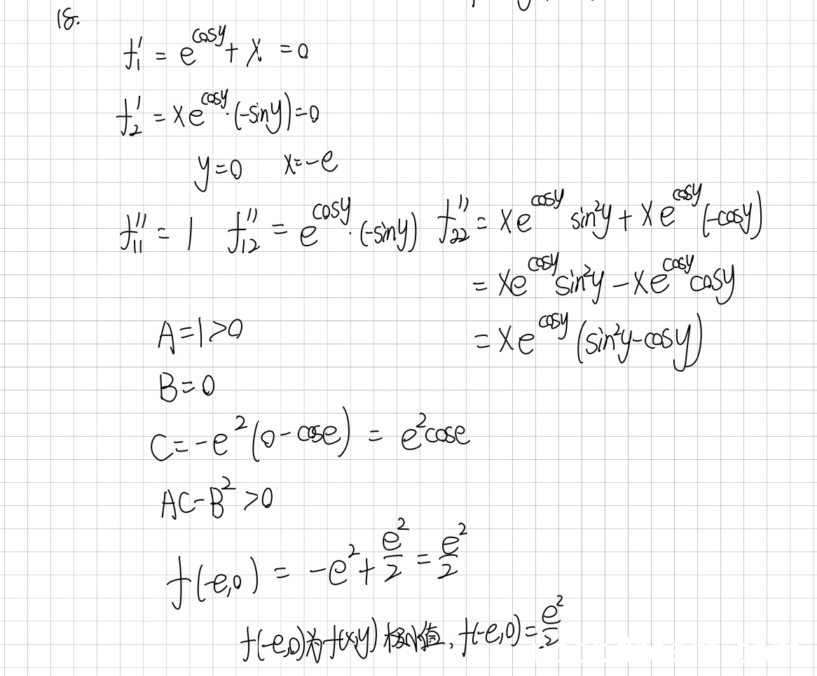 扣分总结:主要扣分点在于二阶偏导数 \(C\) 在驻点处的具体计算错误(将 \(\cos 0 = 1\) 误算为 \(\cos e\)),导致后续判别式数值错误。该错误属于计算错误,非思路错误。根据评分要求,逻辑错误需扣分。因此,在“计算判别式”步骤扣2分,在“判断极值”步骤因结论正确但过程有瑕疵扣1分。其余步骤满分。