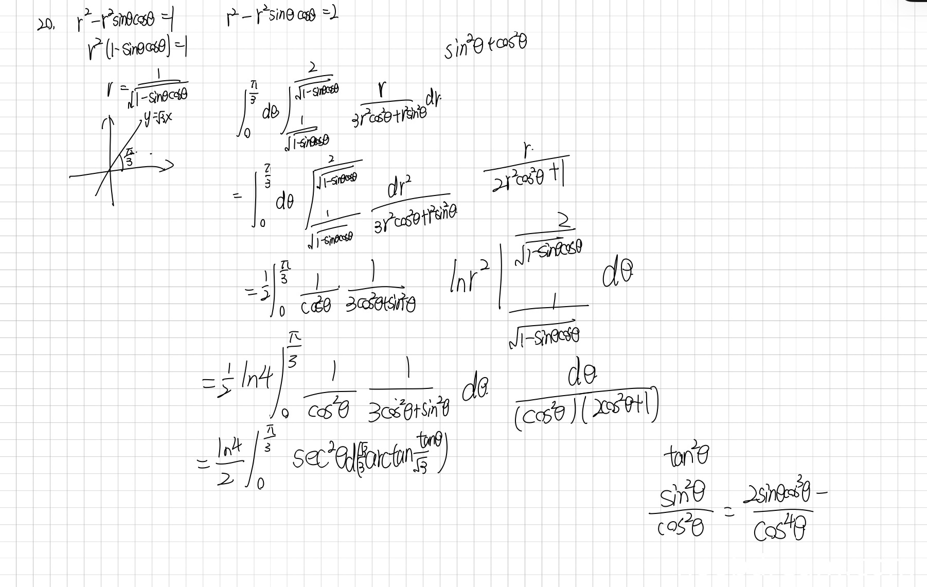 学生作答的整体思路是正确的:将区域边界曲线转化为极坐标方程,确定积分限(θ从0到π/3,r从第一条曲线到第二条曲线),然后代入被积函数进行极坐标变换计算二重积分。这个思路与标准答案一致。