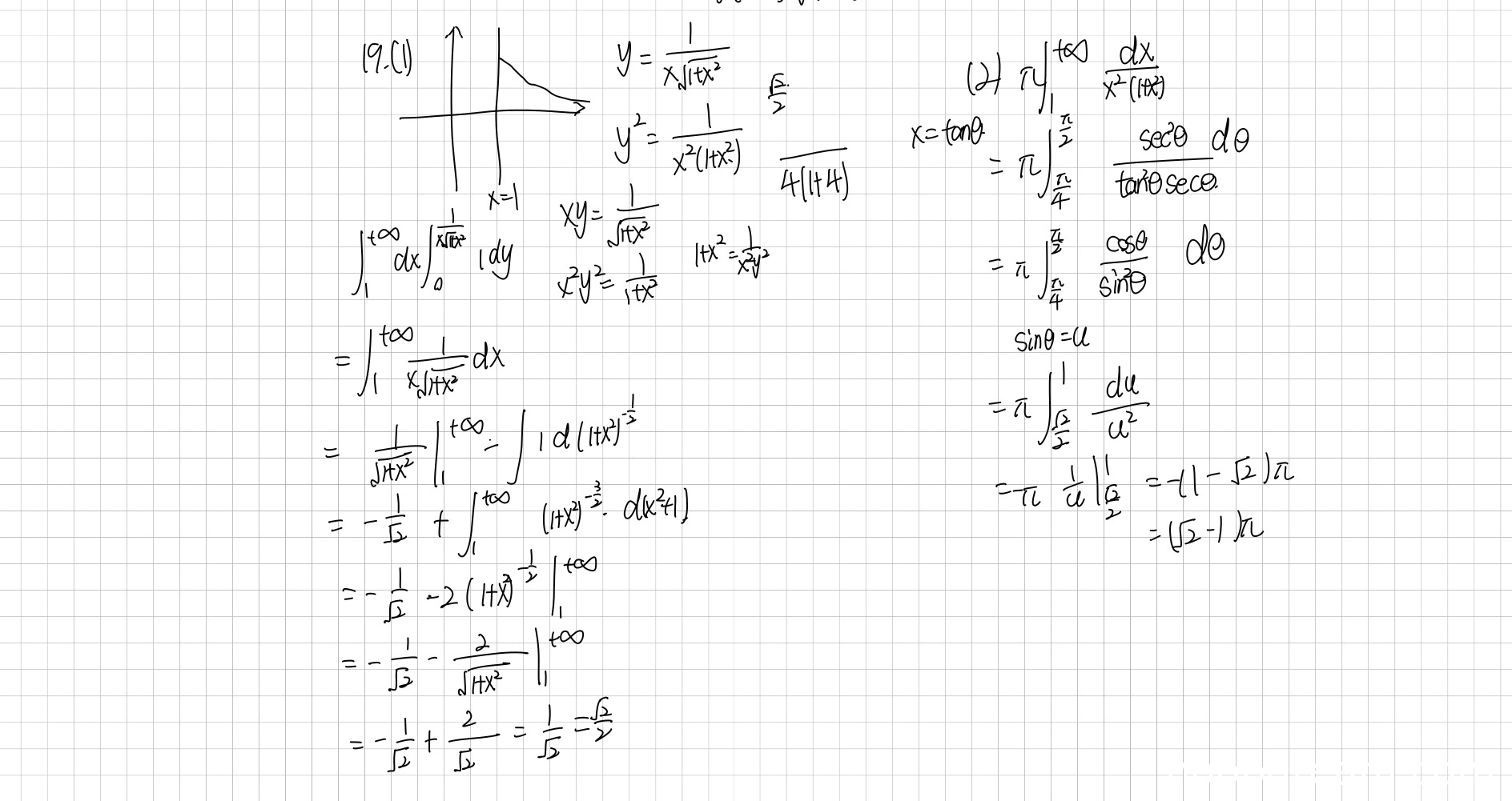 分析:学生正确地写出了旋转体体积公式 \(V = \pi \int_{1}^{+\infty} y^2 dx\),并代入 \(y = \frac{1}{x\sqrt{1+x^2}}\),得到被积函数 \(\frac{1}{x^2(1+x^2)}\)。然而,在第二次识别的文字描述中,积分表达式被误写为 \(\frac{dx}{x^2(1+x)}\)(缺少了 \(x^2\) 的平方),但根据其后续的换元步骤 \(\pi\int \frac{\cos\theta}{\sin^2\theta}d\theta\) 来看,实际计算使用的是正确的被积函数 \(\frac{1}{x^2(1+x^2)}\)。学生的换元法(\(x = \tan\theta\),再令 \(u = \sin\theta\))是可行的,并且计算过程正确,得到了中间结果 \(\pi \int_{\frac{\sqrt{2}}{2}}^{1} \frac{du}{u^2}\)。但是,该积分的正确结果是 \(\pi(1 - \frac{\sqrt{2}}{2})\),而学生计算得出 \(\pi(\sqrt{2}-1)\),说明在最后一步定积分计算时出现错误: