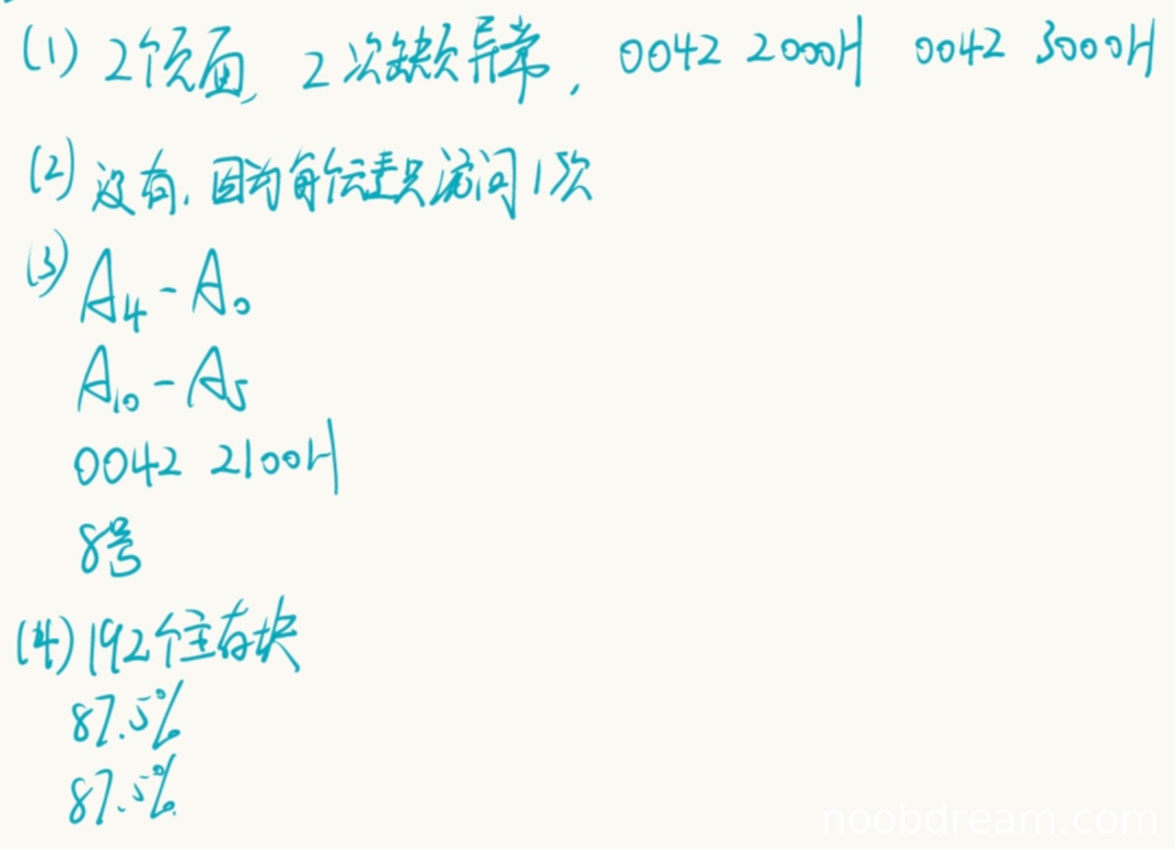 学生答案正确。数组a的大小为24×64×4=6144字节,页面大小为4KB=4096字节,因此需要2个页面存储。由于初始数组不在主存,且不会发生页面置换,访问第一个页面时触发缺页异常(地址0042 2000H),访问第二个页面时触发缺页异常(地址0042 3000H)。学生答案与标准答案完全一致,得3分。