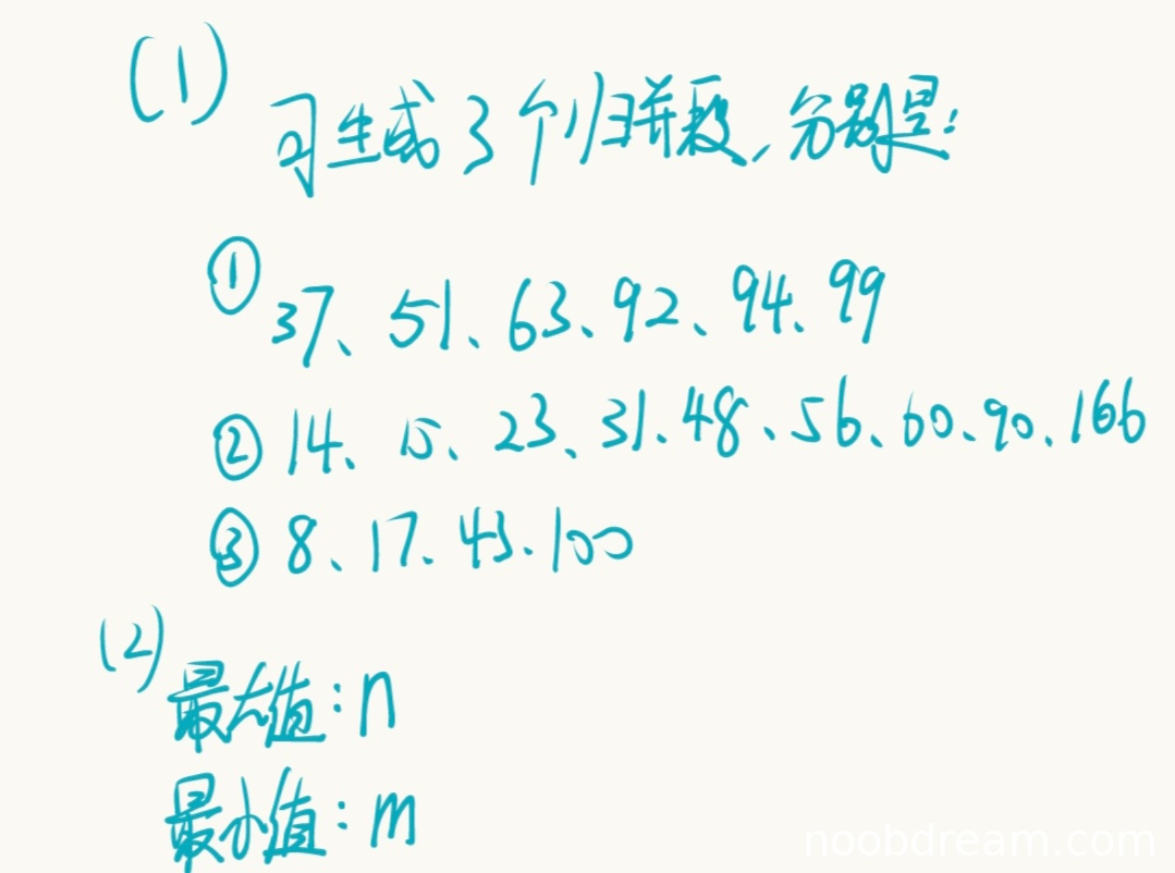 学生答案给出了3个初始归并段,与标准答案一致。归并段的具体内容,在第二次识别结果中完全正确。第一次识别结果中归并段②有一个数字识别为“0”,但根据上下文(原始数据为15)和第二次识别结果,可判定为“15”的误写。因此,该部分答案正确,得8分。
