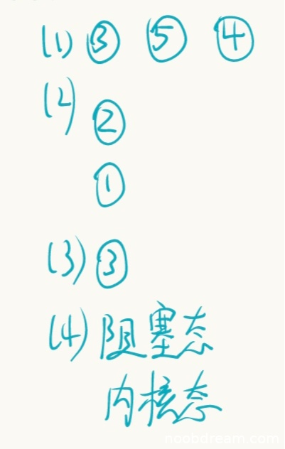 学生答案为“阻塞态”和“内核态”。标准答案为“阻塞状态”和“内核态”。学生答案“阻塞态”是“阻塞状态”的常见简写,意思完全正确。“内核态”与标准答案一致。逻辑正确,得2分。