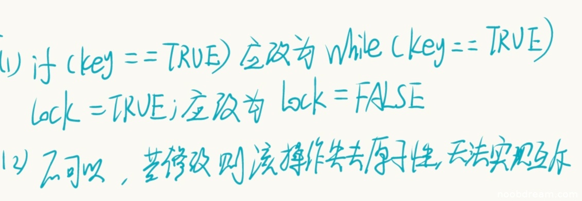 学生答案指出两处错误:①将 if (key == TRUE) 改为 while (key == TRUE);②将 lock = TRUE; 改为 lock = FALSE。这两处修改与标准答案完全一致,正确指出了原伪代码中无法实现互斥和无法解锁的问题。因此,本小题得满分4分。