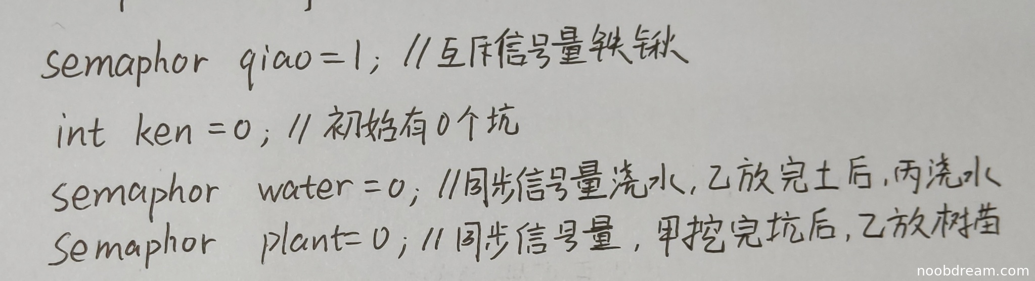 学生定义了三个信号量:qiao(互斥使用铁锹,初值1)、water(同步浇水,初值0)、plant(同步放树苗,初值0),并定义了一个整型变量ken(初始为0)来记录树坑数量。与标准答案相比,缺少一个专门控制可挖坑数量(小于3)的信号量,而是用if(ken<3)判断,这在多进程同步中可能因竞争条件导致错误。此外,信号量命名与标准不同但不影响逻辑。扣1分,因为缺少一个关键同步信号量(sk),且用共享变量ken判断条件未加互斥保护,存在逻辑隐患。得1分。