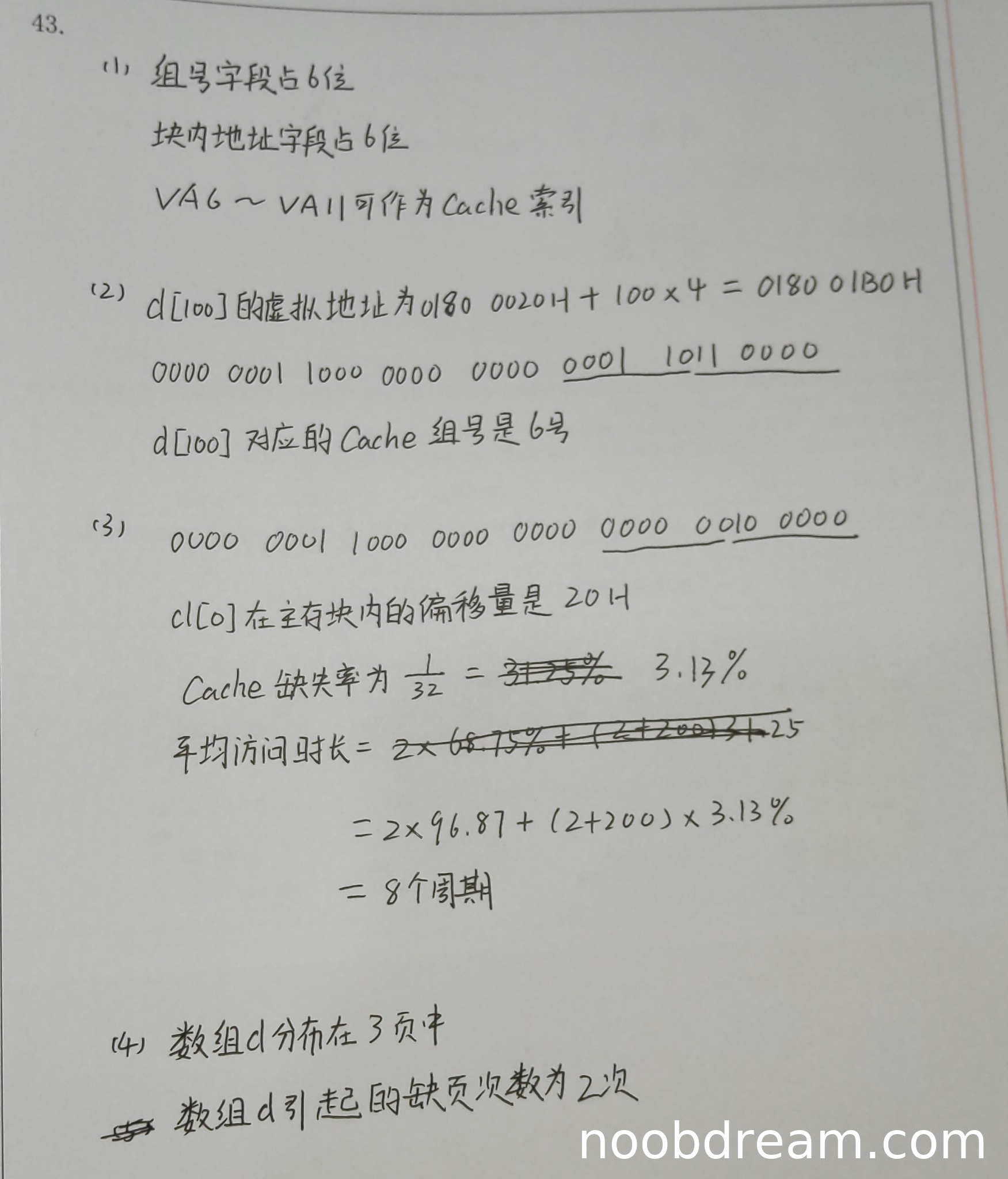 学生答案:d[100]的虚拟地址为0180 01B0H,对应的Cache组号是6号。