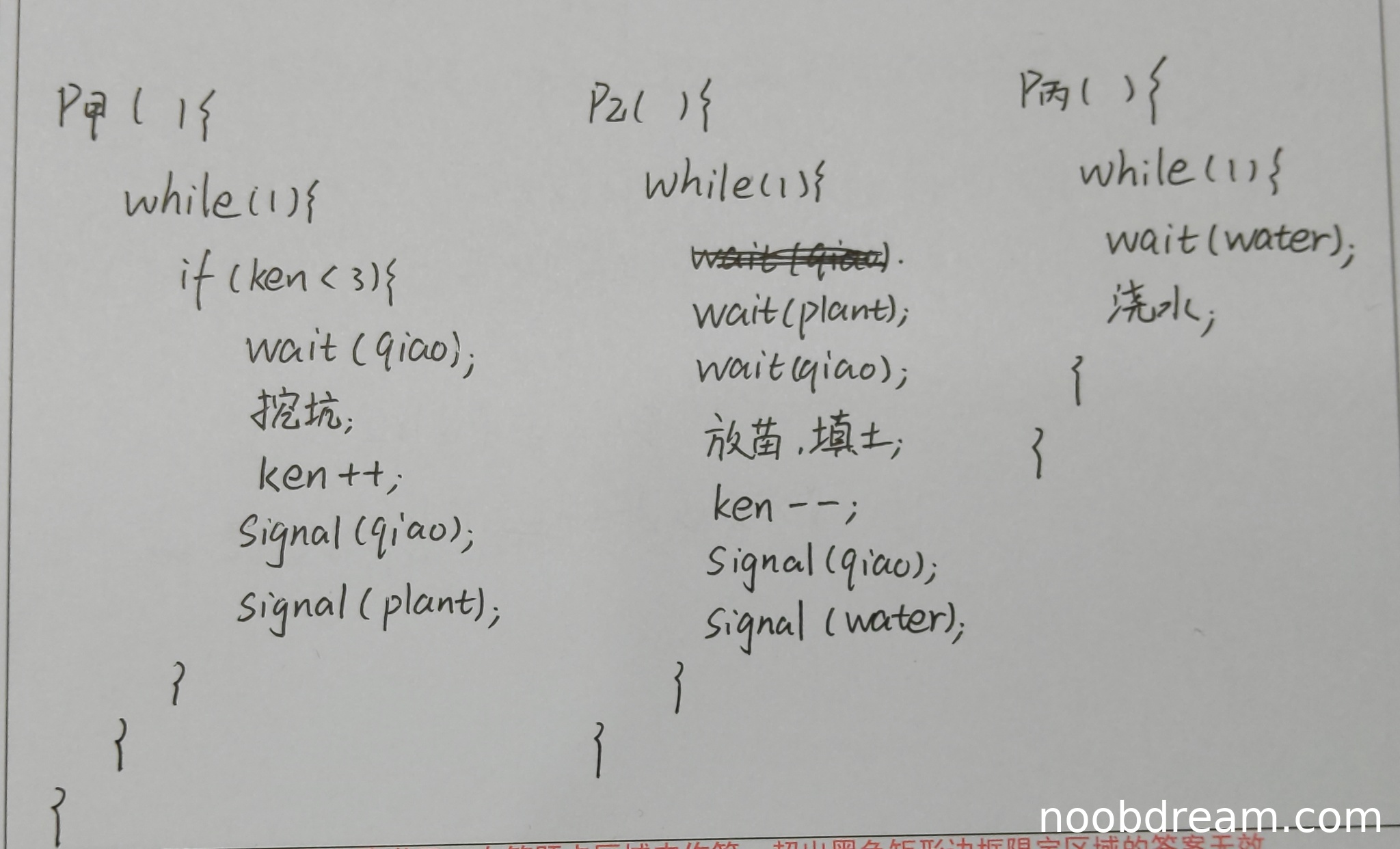 乙中出现了两个wait(qiao),这会导致死锁(申请两次互斥信号量,但只释放一次)。另外,乙先wait(qiao)再wait(plant),顺序可能导致效率问题但不一定错;乙执行后ken--并signal(water)通知丙,但缺少对可挖坑数的恢复信号(如标准中的signal(sk))。逻辑有严重错误(重复wait同一互斥量),扣2分。得0分。