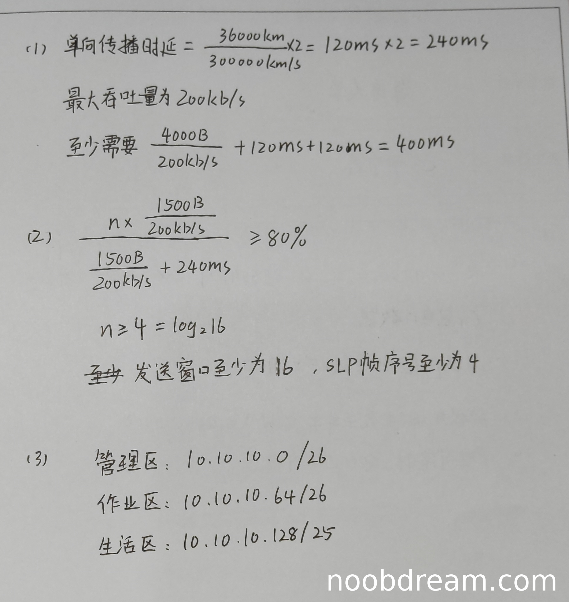 学生答案中计算发送窗口和序号字段的公式有误。标准答案中信道利用率公式的分母应为“2×单向传播时延+发送一帧的时间”,而学生答案的分母为“发送一帧的时间+240ms”,忽略了卫星链路双向传播时延(即RTT)应为2×240ms=480ms。因此,其计算出的发送窗口n≥4和序号字段至少为4是错误的。根据标准答案,发送窗口至少为8,序号字段至少为4位。学生答案中窗口大小错误,但序号字段位数结果碰巧正确(标准答案也是4位),然而由于核心计算逻辑错误,导致窗口大小错误,因此不能给分。得0分。