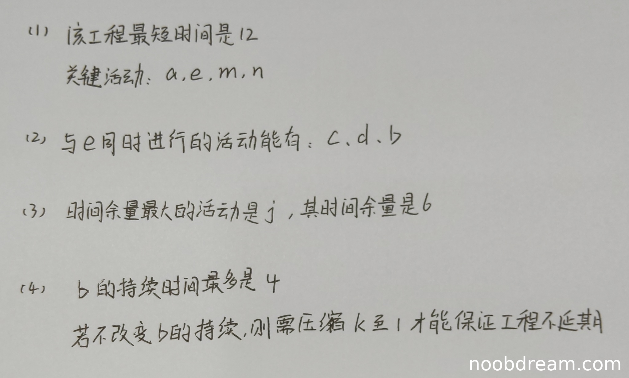 学生答案:最短时间12,关键活动a、e、m、n。与标准答案完全一致。得3分。