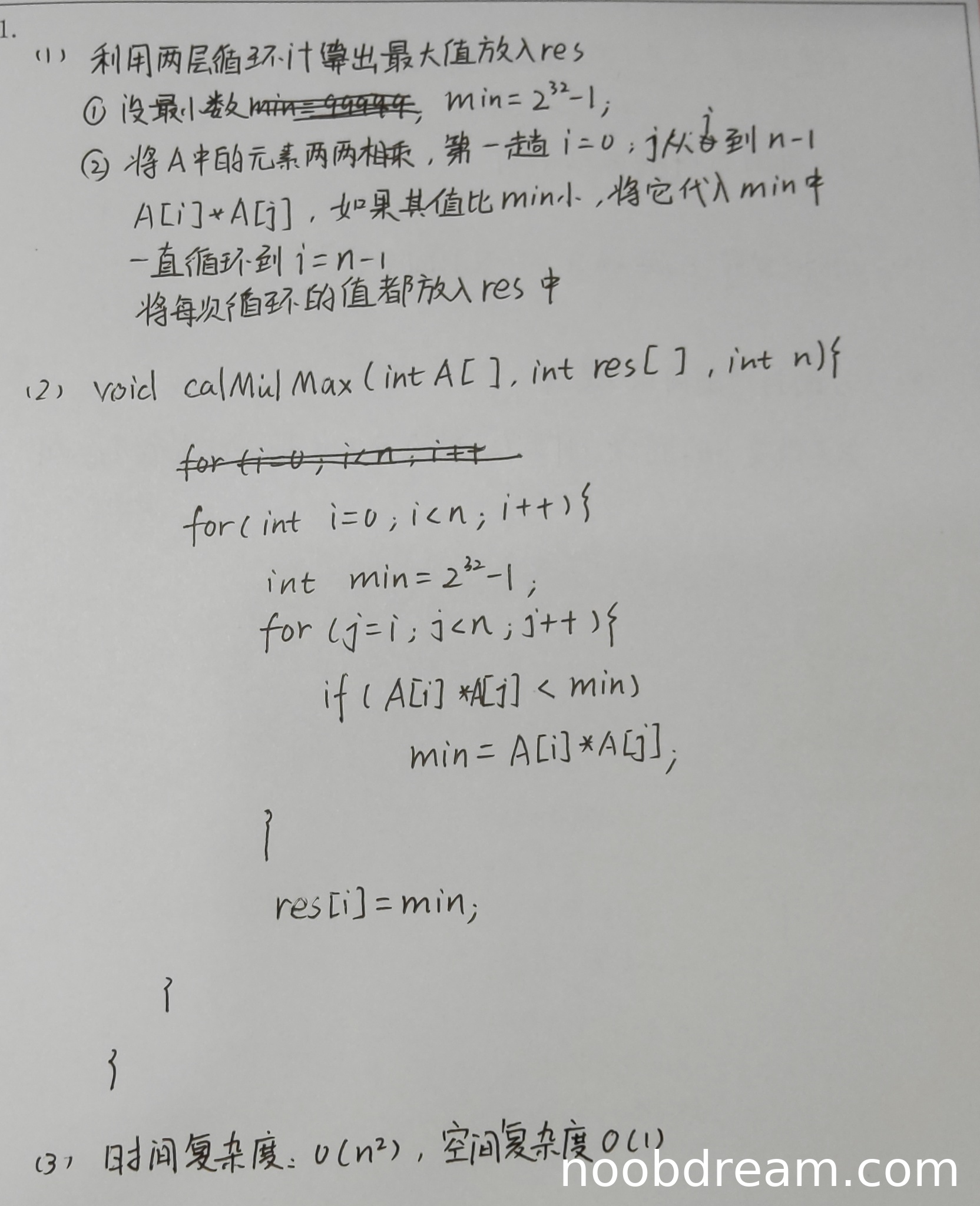理由:根据设计思想实现的代码同样存在逻辑错误。代码中变量名为`min`,初始化为一个极大值(2³²-1),但在内层循环中,它被用来存储A[i]*A[j]的最小值(因为更新条件是`if(A[i]*A[j] < min)`)。最终将`min`赋值给`res[i]`,这导致`res[i]`存储的是A[i]与后续元素乘积的最小值,而非题目要求的最大值。因此,代码无法实现题目功能,属于核心逻辑错误,扣7分。此外,代码中`2³²`的写法在C/C++中是非法的(应为`INT_MAX`或类似常量),但根据“禁止扣分”原则,这属于识别或书写问题,不额外扣分。