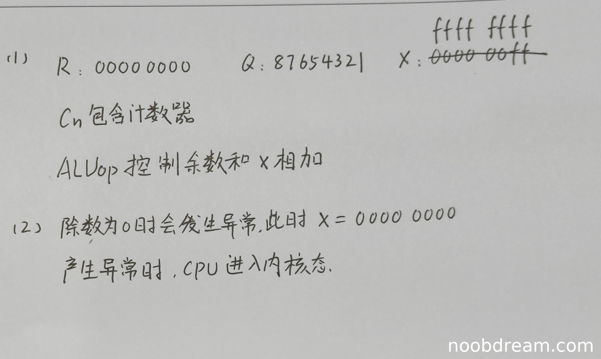 - “R:0000 0000 Q:87654321 X:0000 00ff”:初始值完全错误。根据题目,d[i]=0x87654321,x=0xff,且scov指令将R1符号扩展为64位(R0:R1)。idiv指令执行{R0,R1}/R2(R2为x)。补码除法器初始化时,R应为被除数高32位(即R0,符号扩展后为0xffffffff),Q应为被除数低32位(即R1,0x87654321),Y应为除数(即R2,0xff)符号扩展为32位(0xfffffffe)。学生答案R和Y的值均错误。