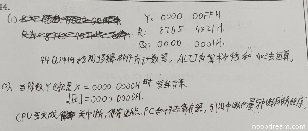学生仅指出了除数为0(x=0)这一种异常情况,且错误地认为此时d[i]也必须为0(d[i]=0000 0000H)。标准答案中除数为0异常时,d[i]为任意值。学生完全遗漏了溢出异常(被除数为-2^31且除数为-1)的情况。对于异常响应操作,学生的回答“关中断,保存断点、PC和标志寄存器,引出中断向量和中断服务程序”基本涵盖了标准答案的核心步骤(关中断、保存断点、跳转),表述虽不完全精确但思路正确。因此,异常情况分析部分基本错误,响应操作部分基本正确。扣除相应分数后,给予2分。