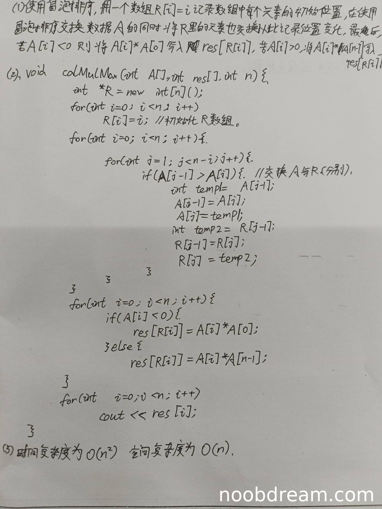 理由:学生作答的基本设计思想是:先对数组A进行排序(冒泡排序),同时记录原始位置;排序后,对于每个元素A[i],若其为负数则乘以排序后的最小值(A[0]),若为正数则乘以排序后的最大值(A[n-1]),并将结果存入res的对应原始位置。这个思路在逻辑上可以计算出每个A[i]与后续元素乘积的最大值,但存在以下问题: