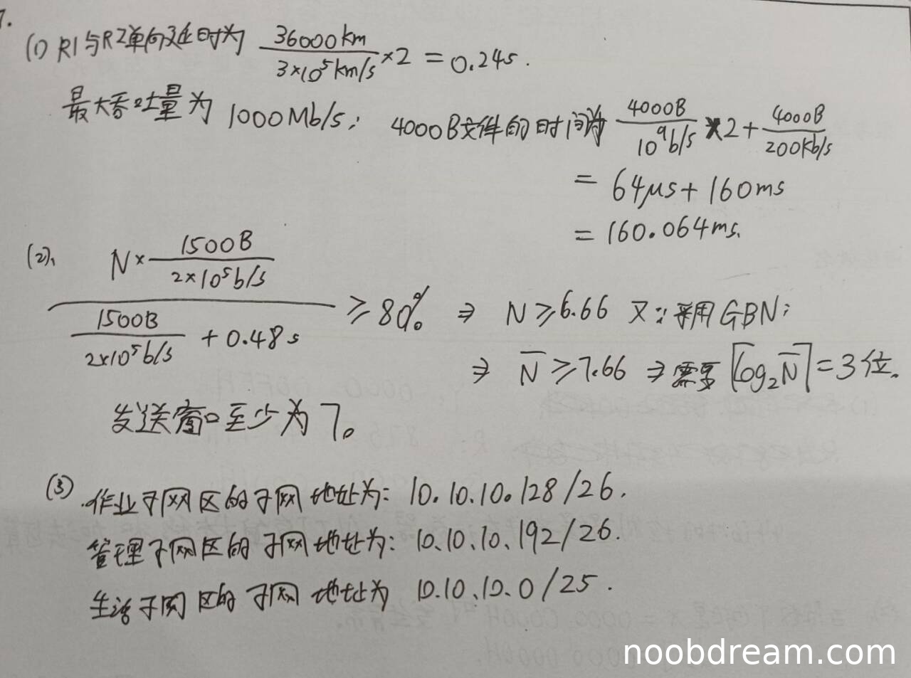 学生计算信道利用率的分母中包含了双向传播时延(0.48s),思路正确,但计算过程存在笔误(如将数据传输速率写为2×10^5 b/s,应为200×10^3 b/s,但数值影响不大),且最终计算出发送窗口至少为7(标准答案为8),这是一个逻辑错误,扣1分。
