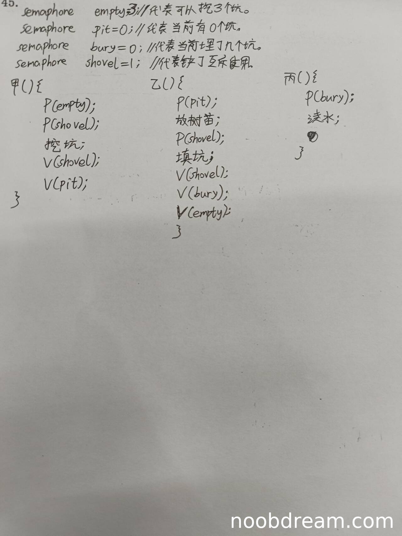 乙:先等待有坑可用(P(pit)),放树苗,再申请铁锹(P(shovel)),填坑后释放铁锹(V(shovel)),然后通知丙需要浇水(V(bury)),并释放一个可挖坑名额(V(empty))。逻辑正确。