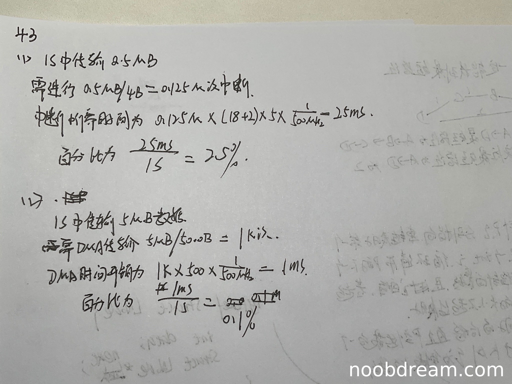 学生两次识别中均正确计算DMA次数为1K次(1000次),时间开销为1ms(正确,1000 × 500 × (1/500M) = 0.001s = 1ms),百分比0.1%正确。得4分。
