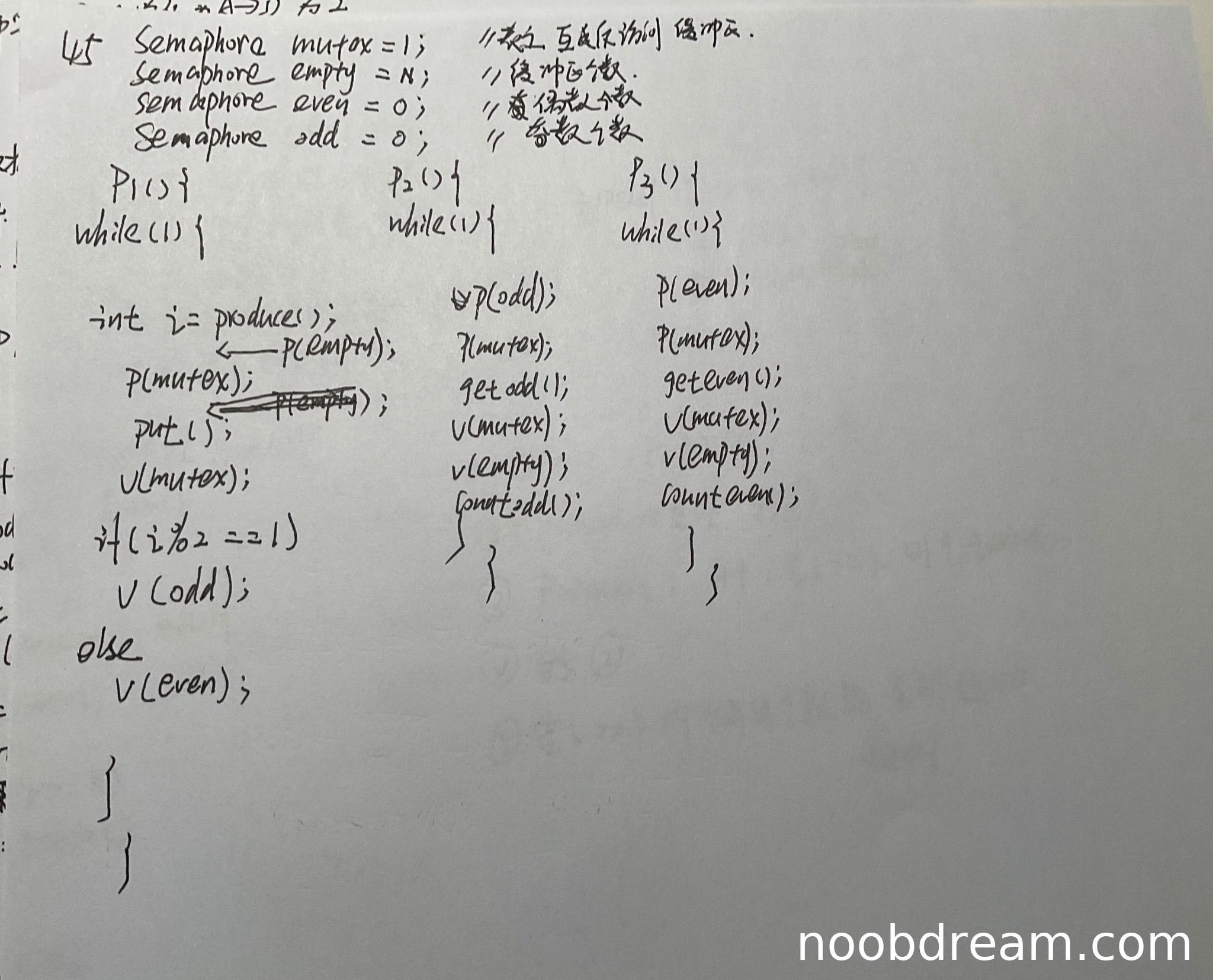 学生答案在两次识别中均正确定义了四个信号量(mutex、empty、even、odd),含义与标准答案一致。P1、P2、P3的同步与互斥逻辑基本正确,但存在一处关键逻辑错误:在P1进程中,两次识别结果均显示在V(mutex)后执行了V(empty)(第一次识别)或未执行V(empty)(第二次识别),但标准答案中P1不应在放入数据后立即V(empty),而应由消费者(P2或P3)在取走数据后执行V(empty)。第一次识别中P1多写了V(empty),这会导致empty计数错误(多释放空单元),破坏同步;第二次识别中P1缺少V(empty),但根据上下文判断可能是识别遗漏(因为P2和P3中都有V(empty)),且学生答案中P2和P3正确执行了V(empty),因此整体思路正确。但第一次识别中P1的V(empty)是明显错误,扣1分。另外,P2和P3中在P(odd)或P(even)后直接P(mutex),未考虑互斥与同步信号量的顺序问题,但标准答案中也是如此,故不扣分。综上,扣除1分,得6分。