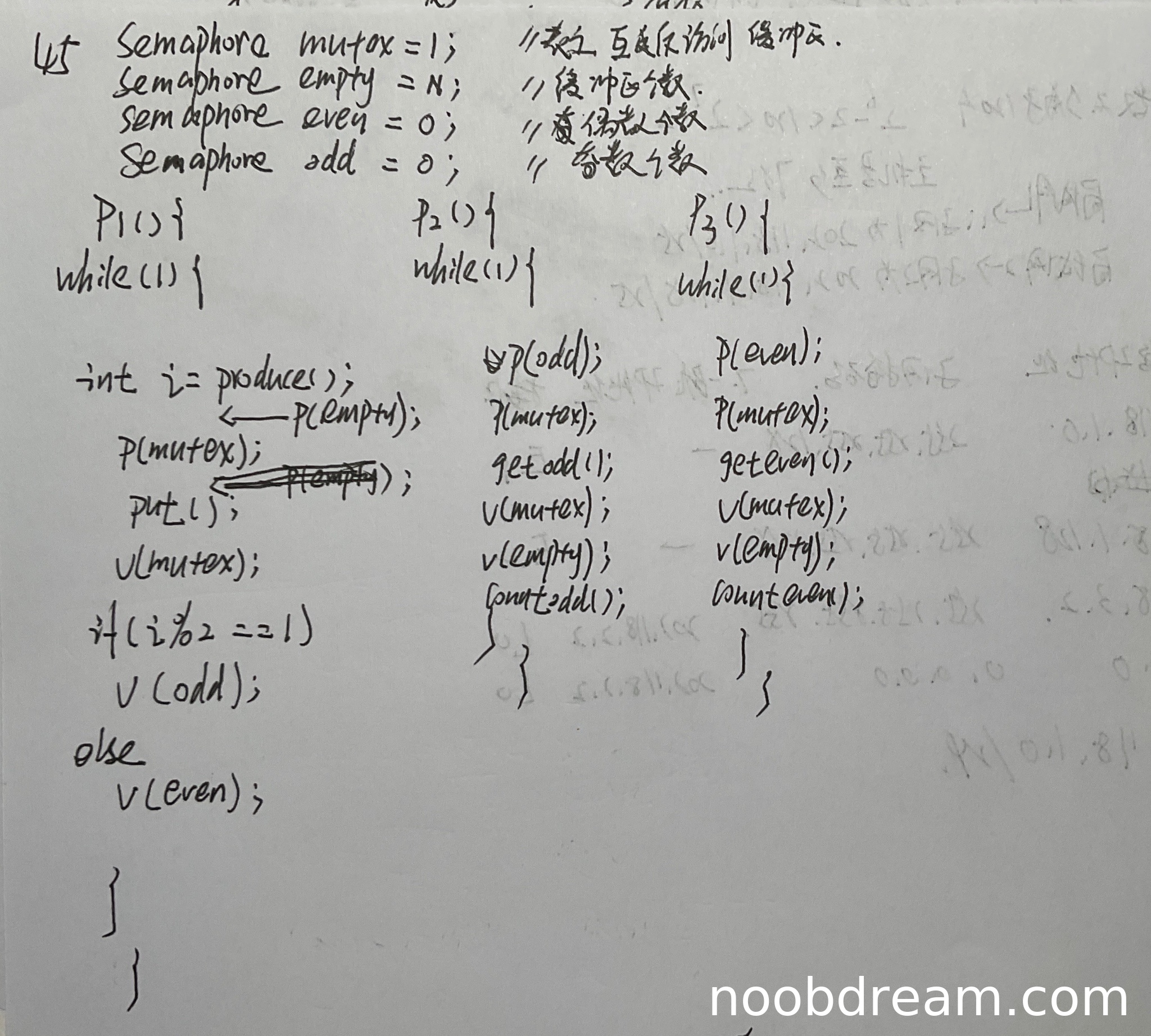 得分:2分。理由:P1中先生成数据,再P(empty)检查空单元,然后P(mutex)互斥访问缓冲区,执行put()后V(mutex)释放缓冲区,最后根据数据奇偶性V(odd)或V(even)通知消费者。逻辑完全正确,与标准答案一致。