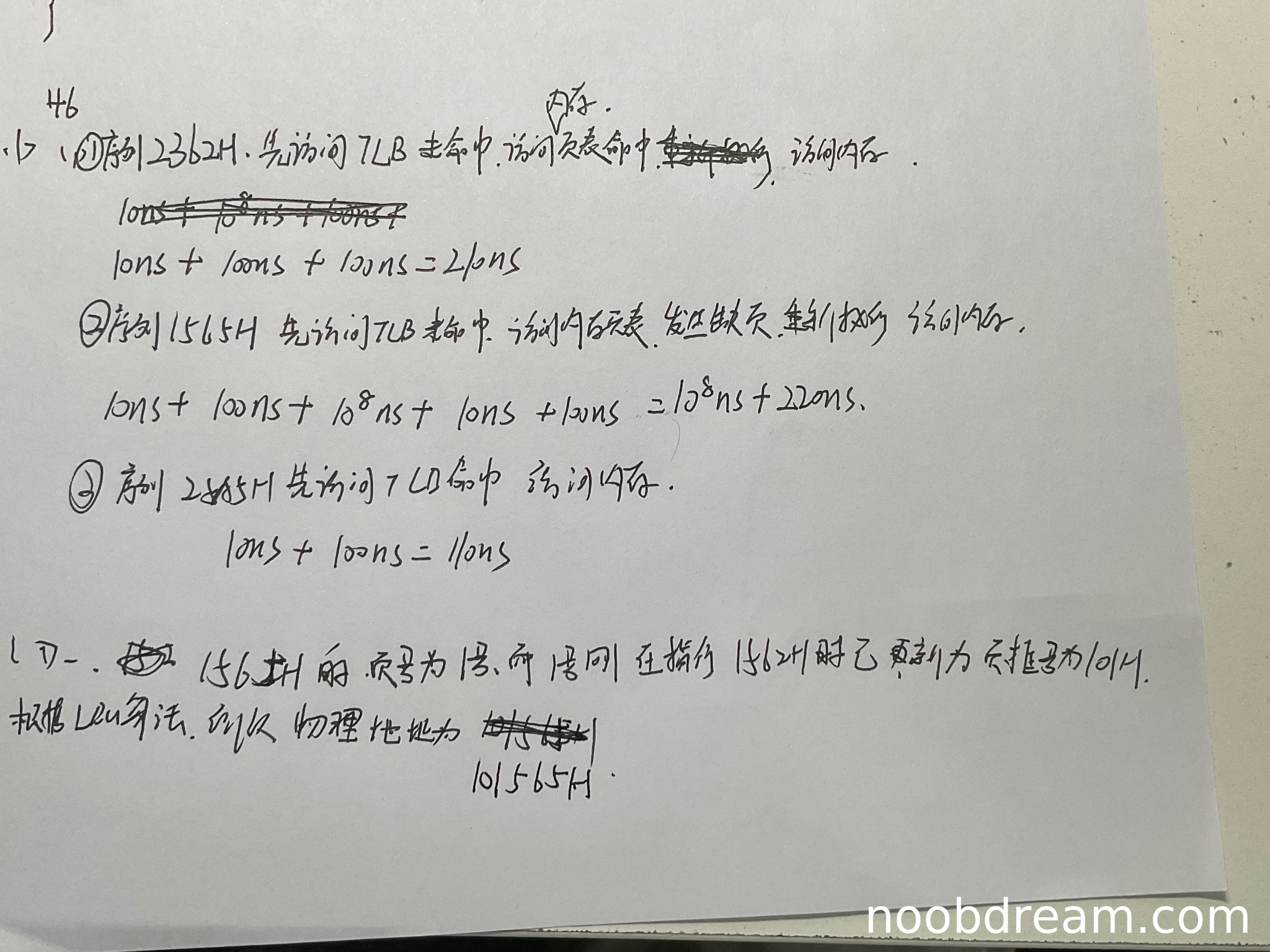 第1次识别结果中,对于2362H的时间计算为210ns,正确;对于1565H的时间计算为10^8ns + 220ns,正确;对于25A5H(识别为2865H或2855H,但根据上下文判断为误写,应为25A5H)的时间计算为110ns,正确。但第1次识别中2362H部分错误地包含了“访问TLB命中”和“10⁸ns”的冗余项,但最终计算结果正确,且识别结果中存在误写(如“序到”应为“虚地址”),根据规则不扣分。第2次识别结果中,三个虚地址的时间计算均正确。因此,本部分得6分。