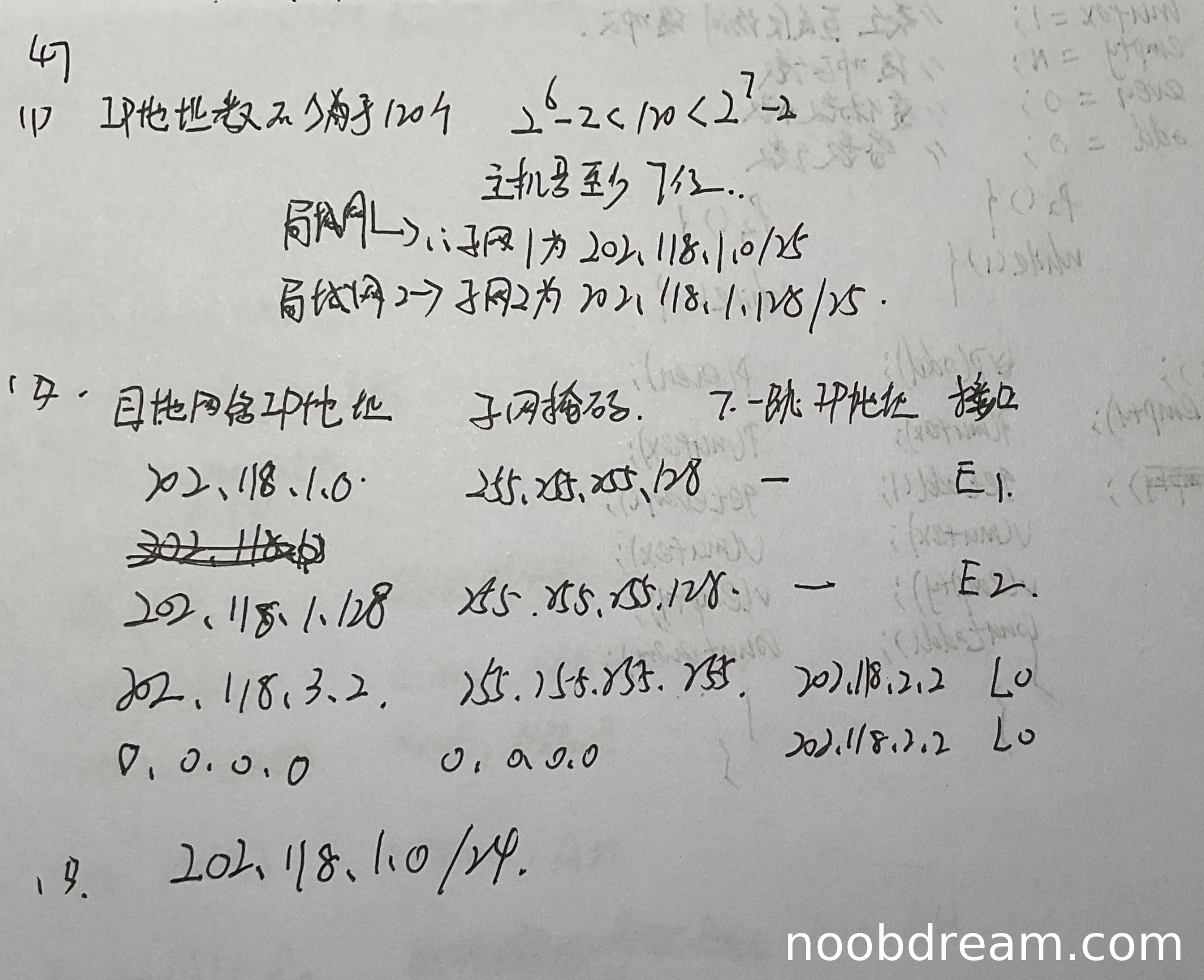 学生正确计算了子网划分:由于每个局域网需要不少于120个IP地址,根据2^6-2=62<120<126=2^7-2,主机号需要7位,因此子网号占1位(因为原网络前缀为24位,总主机位8位)。划分结果为子网1:202.118.1.0/25和子网2:202.118.1.128/25,并正确分配给局域网1和2。理由充分,计算正确。得3分。