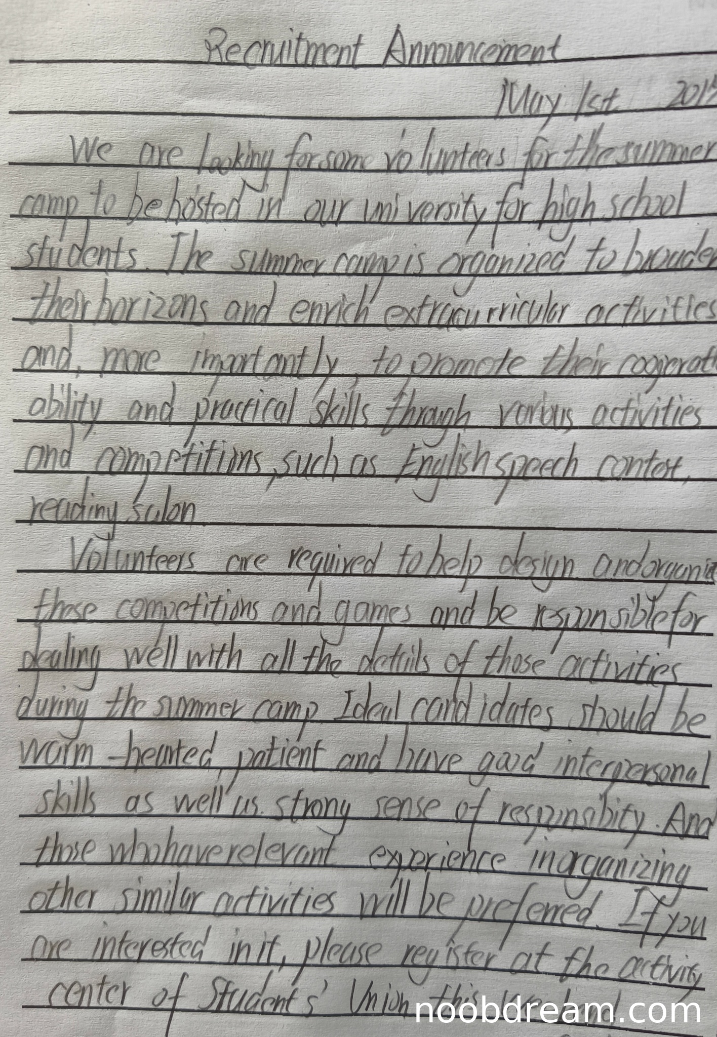 理由:第二次识别包含标题"Recruitment Announcement"和日期"May 1st, 2015",符合应用文格式要求;语域正式恰当(如使用"We are looking for"等正式招募用语)。第一次识别虽无标题和日期,但根据规则以正确识别为准,故不扣分。