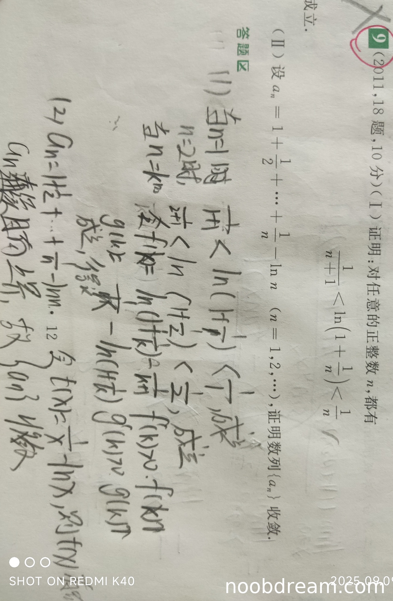 学生两次识别结果均正确证明了数列\(\{a_n\}\)的单调性和有下界性:利用(1)中结论得到\(a_{n+1}-a_n<0\)(单调递减),并通过不等式放缩得到\(a_n > \ln(n+1)-\ln n > 0\)(有下界)。应用单调有界收敛定理得出收敛结论。逻辑完整且与标准答案一致。但第一次识别中误写“12令\(t(x)=\frac{1}{x}-\ln x\)”为无关内容,属于识别错误,不扣分。因此得5分(满分5分)。
