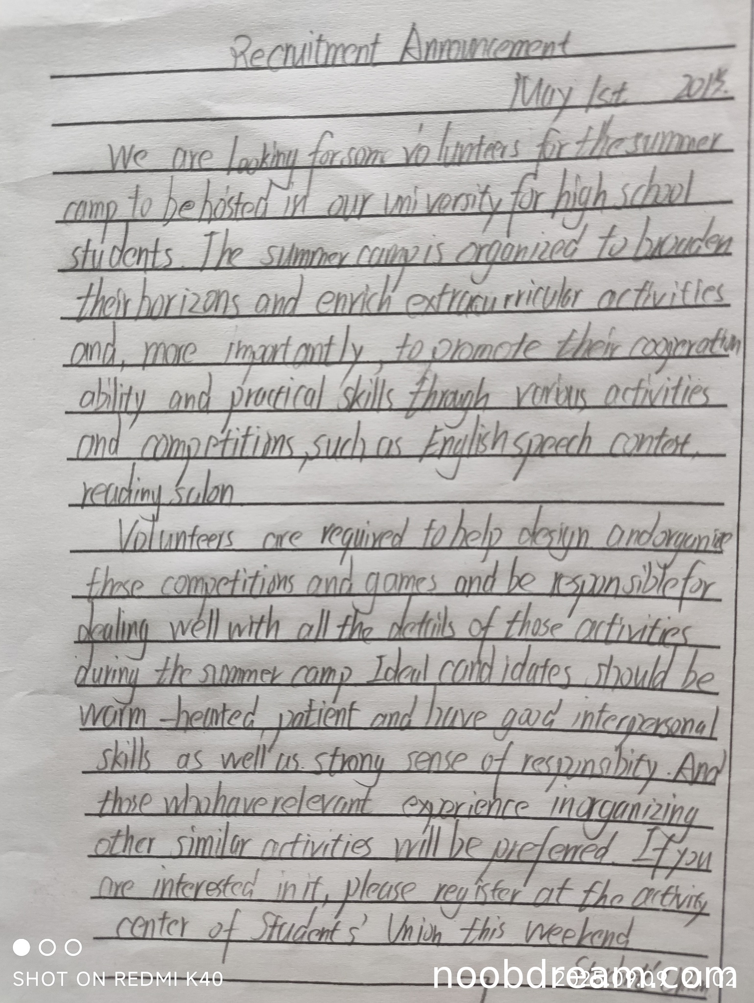 理由:格式正确,包含标题"Recruitment Announcement"和日期(第二次识别)。语域恰当,使用正式公告语气,符合招募启事的文体要求。