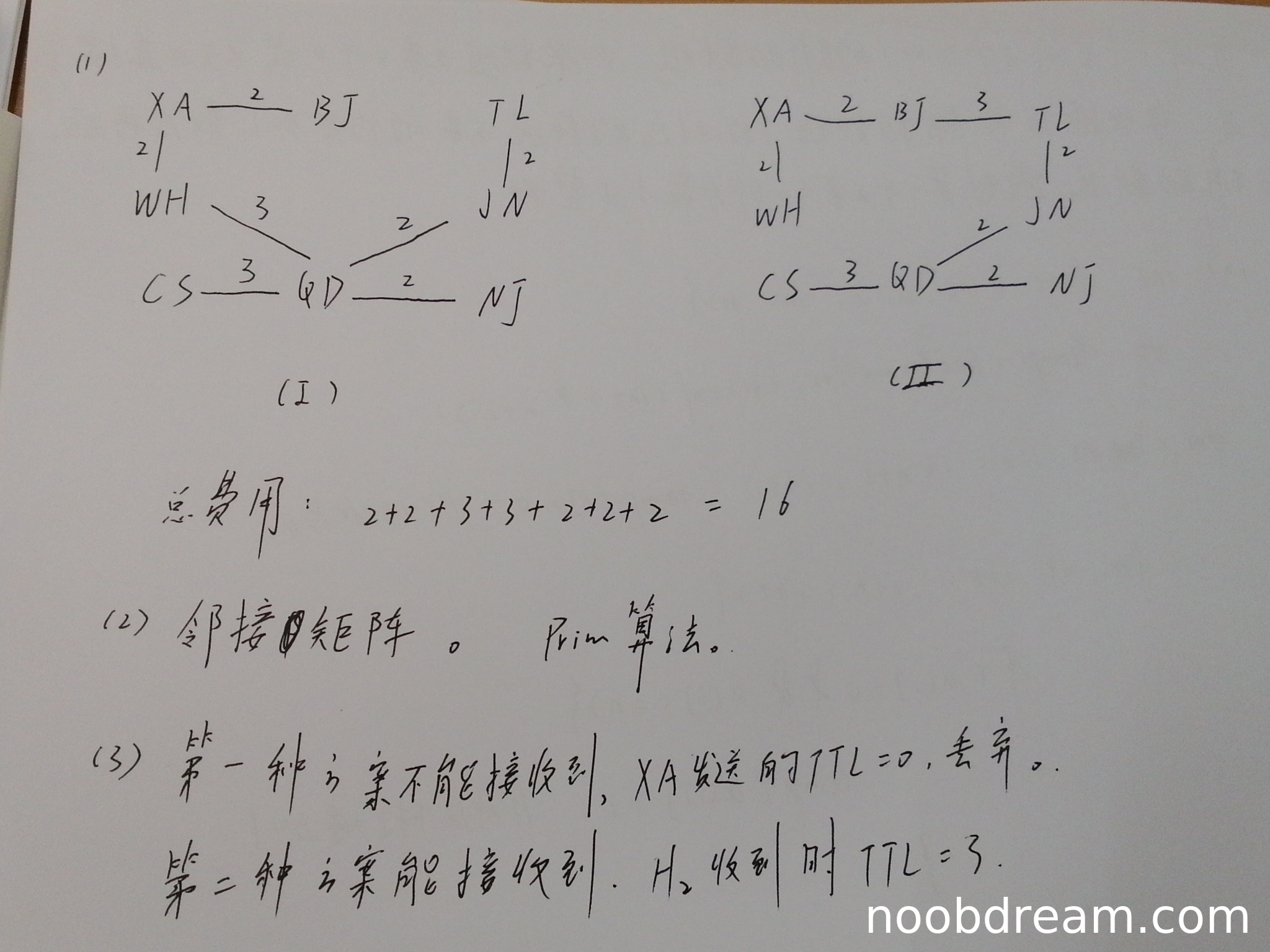 学生分析了两种方案:第一种方案中TL到BJ路径较长(需经多跳),TTL=5可能不足(学生指出XA发送时TTL=0丢弃,但具体路径描述不准确,但结论正确);第二种方案TL与BJ直接相邻(学生指出H2收到时TTL=3,结论正确)。标准答案中方案1不可达、方案2可达,学生结论正确。但学生未明确区分方案,而是综合回答,但核心判断正确。得2分。