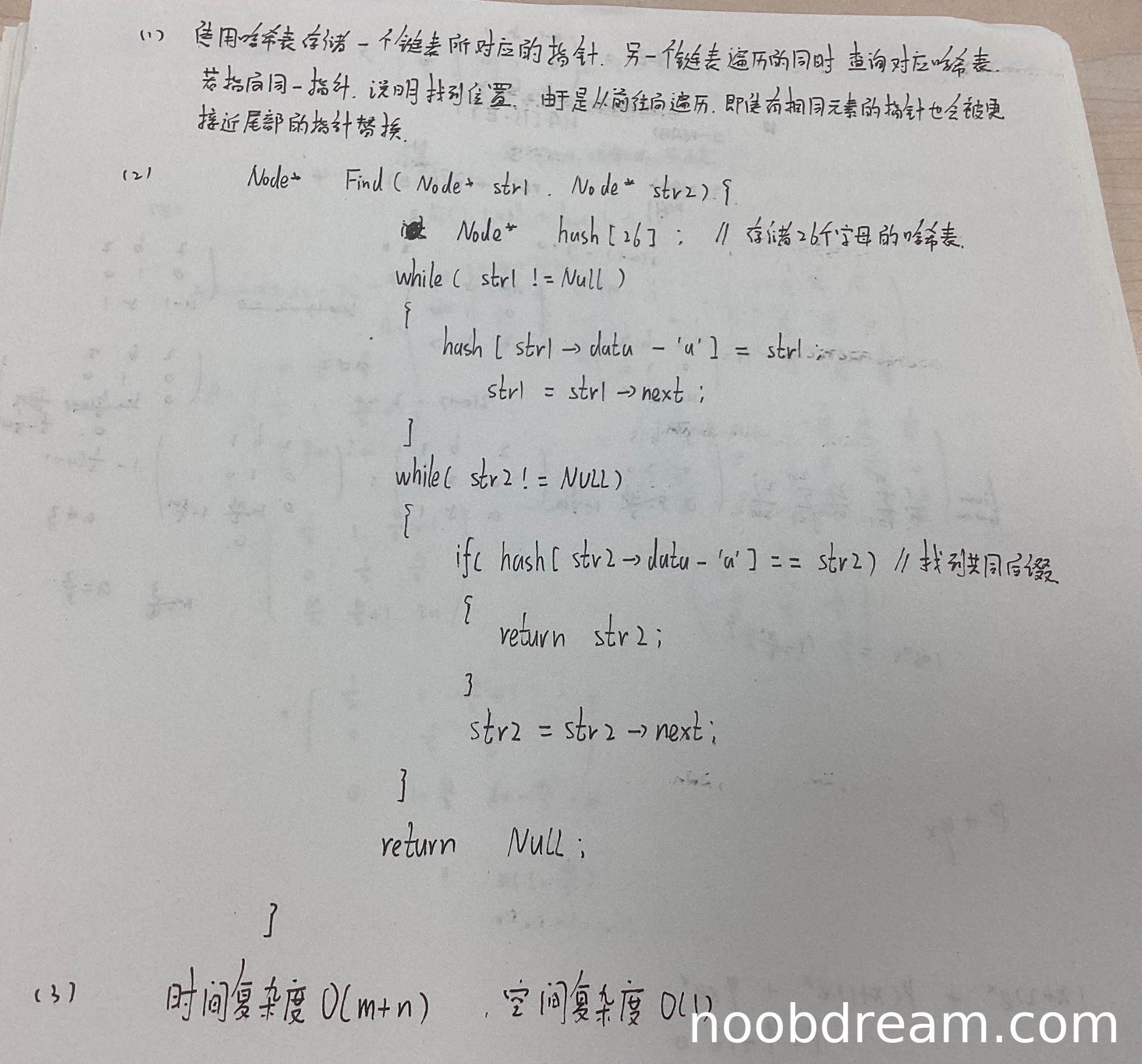 得0分。学生给出的时间复杂度O(m+n)和空间复杂度O(1)是基于错误算法得出的,虽然时间复杂度分析正确(两次遍历),但空间复杂度错误:哈希表大小固定为26,但这是常数空间,但算法本身错误,因此不得分。