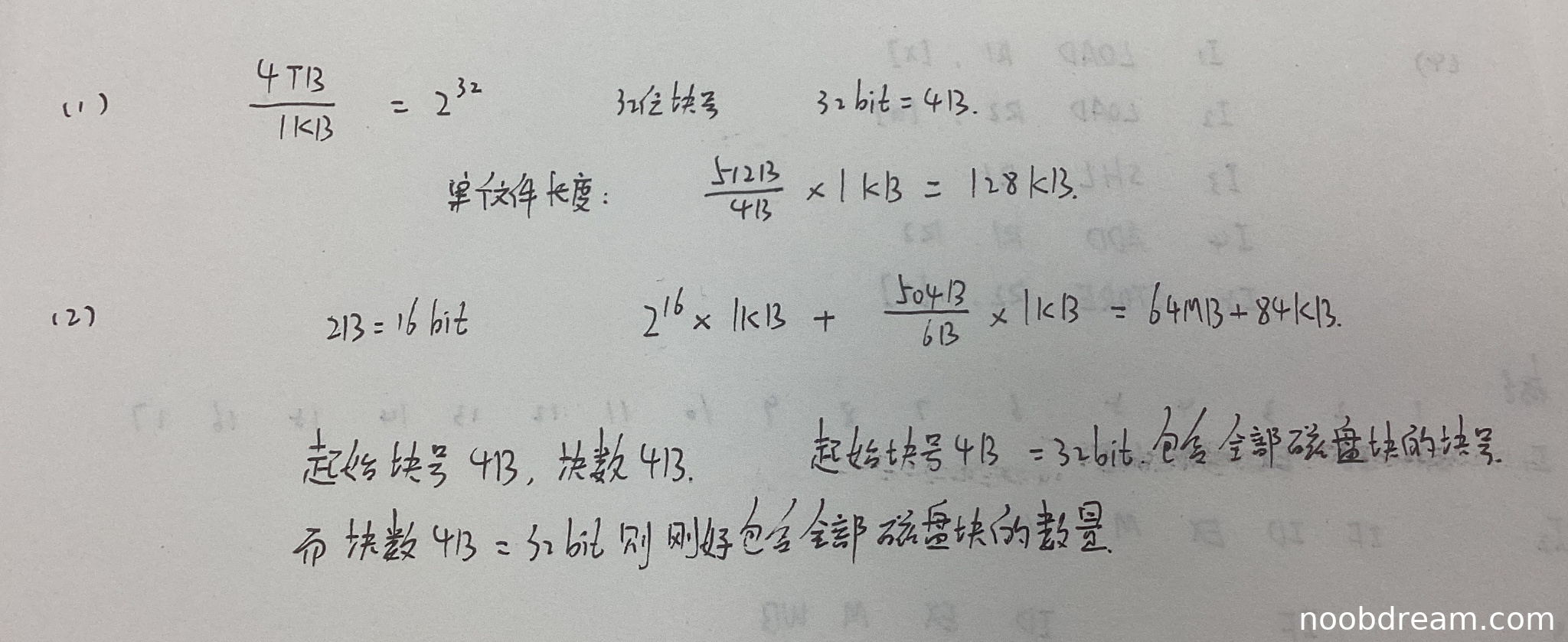 学生答案正确计算了块号所需字节数(4B)和最大文件长度(128KB),与标准答案一致。第一次识别中"4T13"和"1K13"等识别错误明显为误写(应为4TB和1KB),但核心逻辑正确,因此不扣分。得4分。