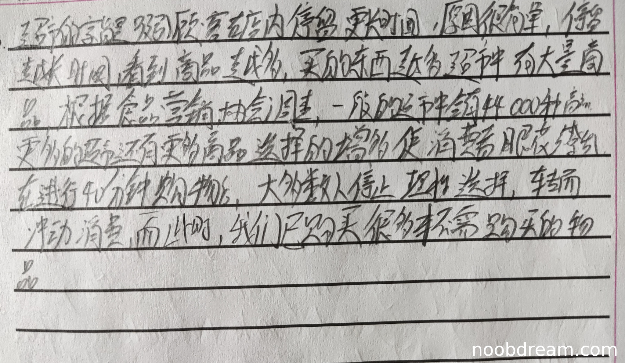 学生两次识别结果均准确传达了原文核心信息,包括超市吸引顾客延长停留时间的原因、商品数量数据(4000种)、购物时间(40分钟)对消费行为的影响(理性选择转为冲动消费)以及最终结果(购买非必要物品)。虽然存在少量表述差异(如“宗旨”替代“货架”、“本无需购买”替代“不需要购买”),但均属于合理同义转换或误写范畴,不影响逻辑完整性。根据评分规则,逻辑正确且无实质性错误,因此不扣分。