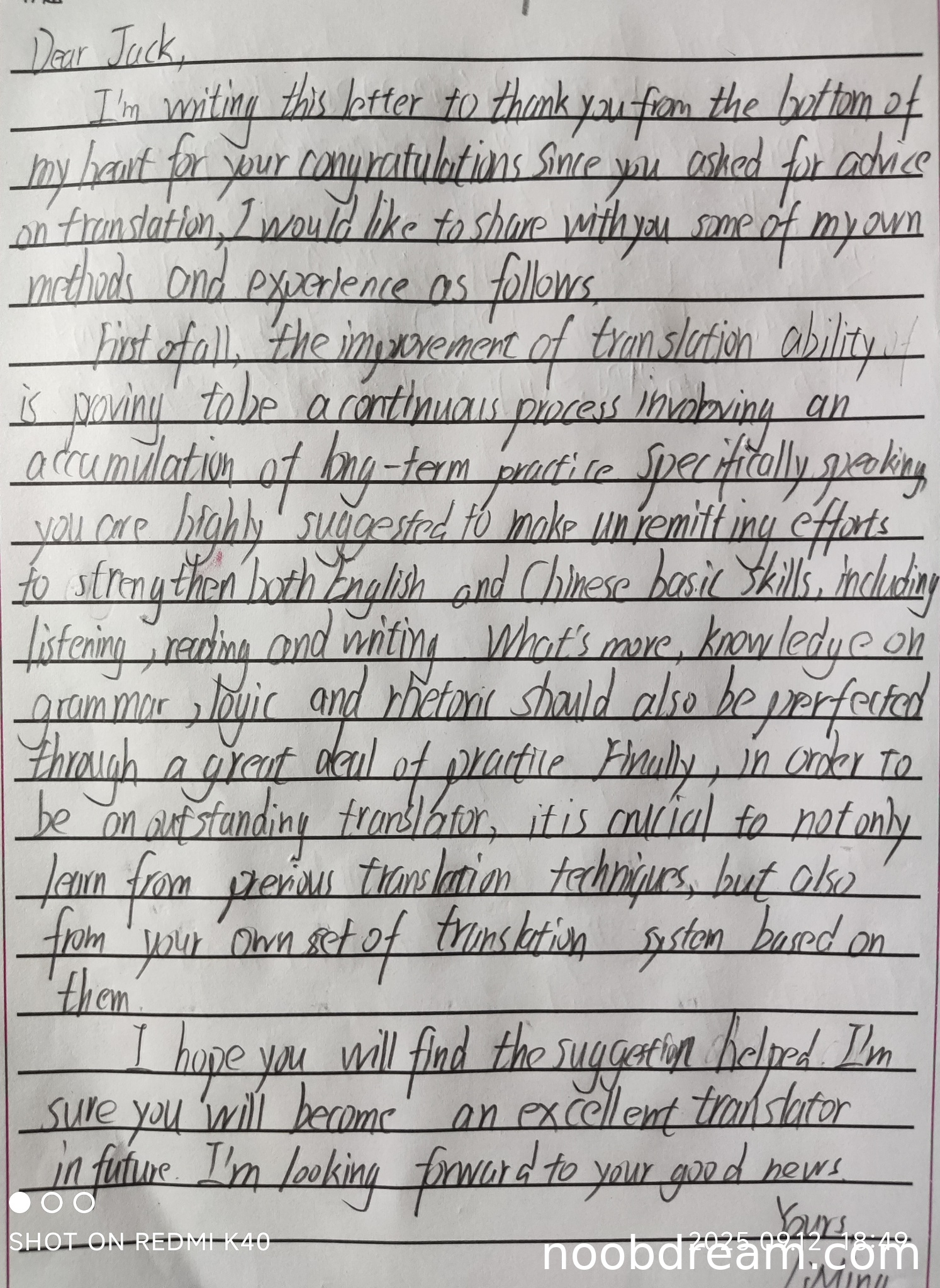 本次小作文题目要求写一封感谢信并提供翻译建议。学生作答内容完整覆盖了感谢和具体建议两个核心要点,语言流畅自然,语法和词汇错误极少(如第二次识别中"form your own"虽存在拼写误写可能,但结合上下文应为"form"的合理使用,不扣分)。格式正确(包含称呼、正文、结尾敬语和签名),语域恰当(正式与非正式混合,符合书信场景)。逻辑清晰,通过"First of all""Specifically speaking""What's more""Finally"等衔接词实现连贯。根据评分标准,属于第五档(优秀),得9分(因极微小瑕疵不扣至满分)。
