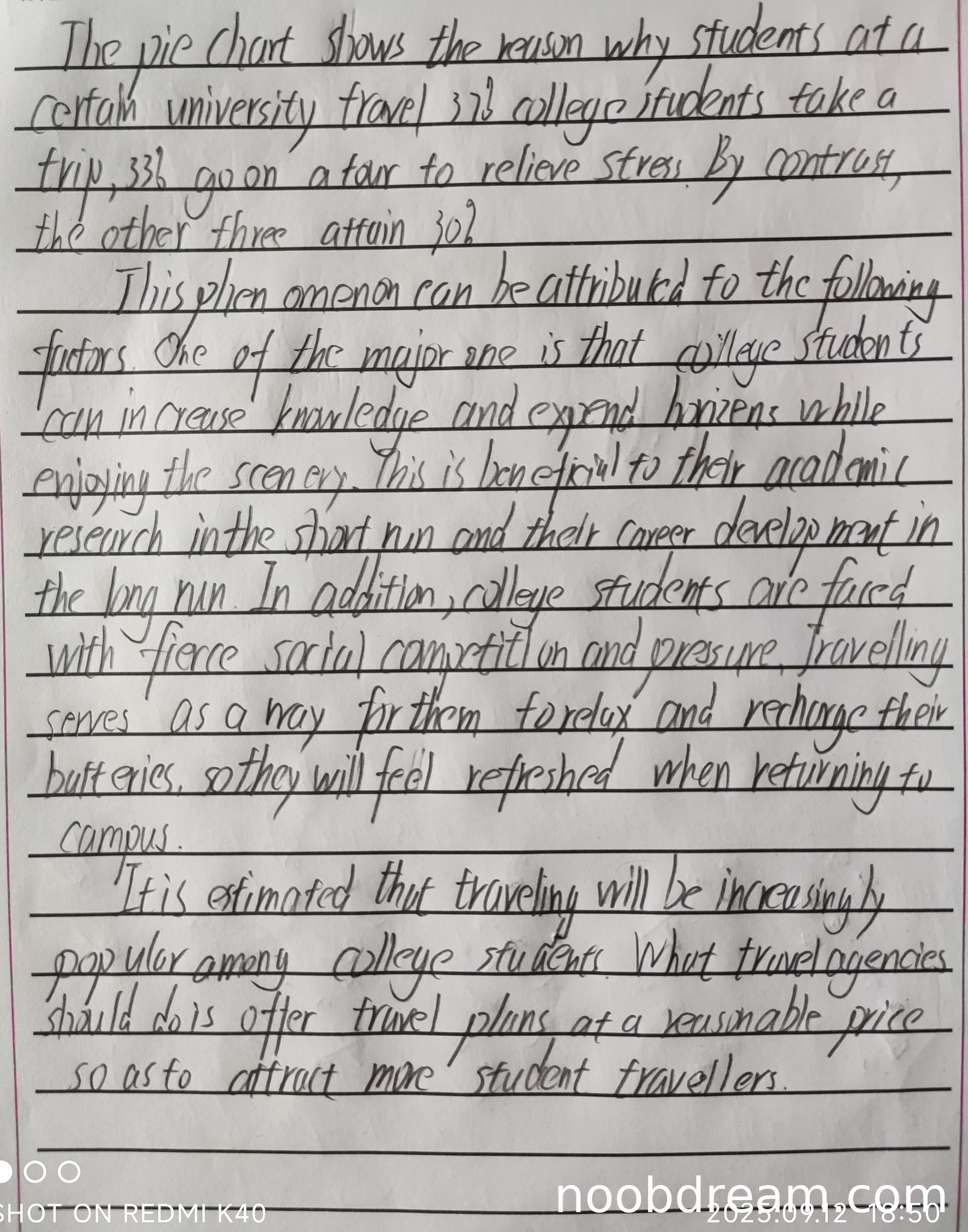 词汇:使用较高级词汇(expand horizons, fierce competition, recharge batteries等),但重复使用travel(应交替使用trip/journey等),且"attain"误用影响精度。符合第二档标准。