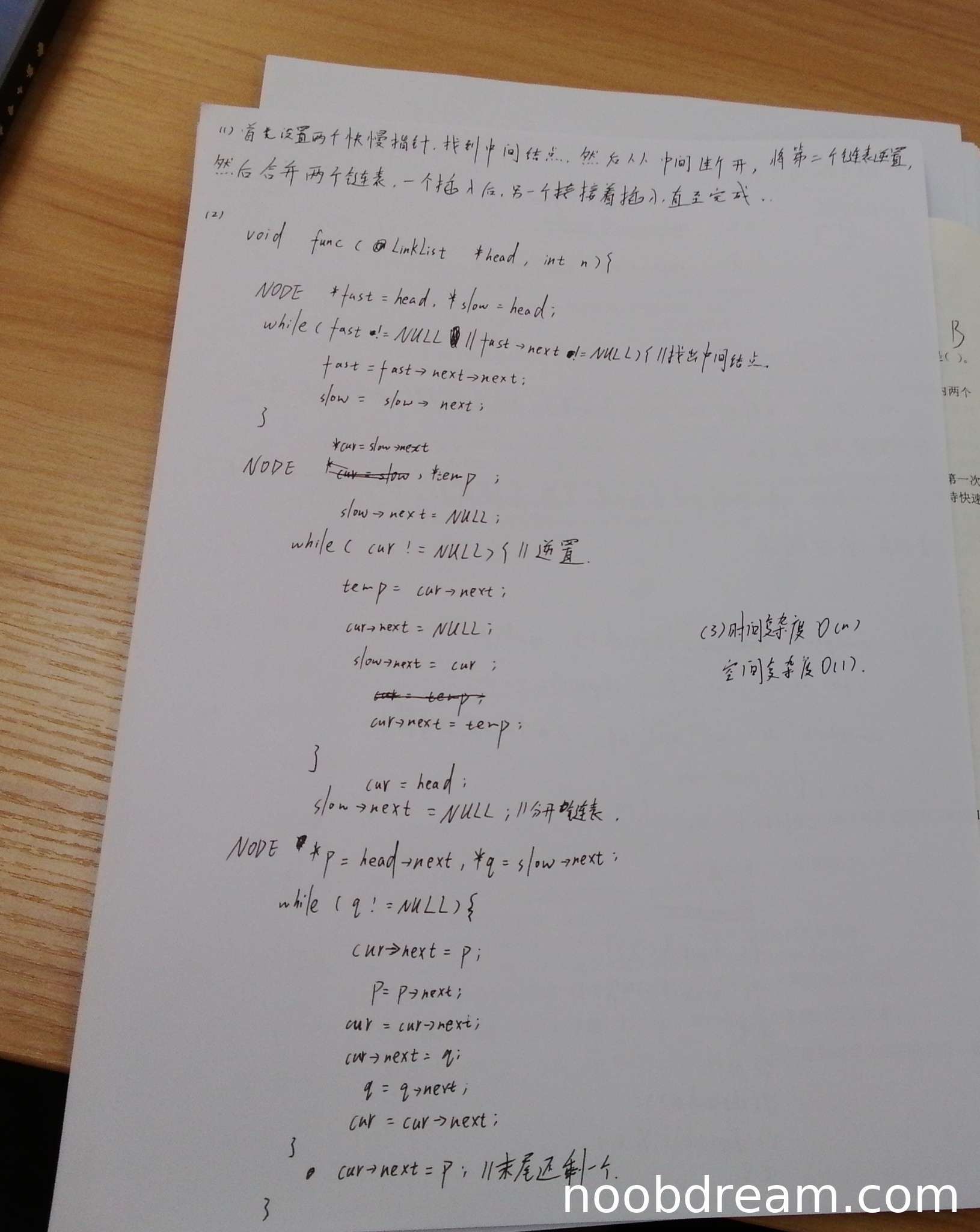 4. 合并链表部分:`cur = head;`后直接操作,但head是头结点,合并时应跳过头结点;且合并逻辑未正确处理交替插入(标准答案需保存后继指针)。扣2分。