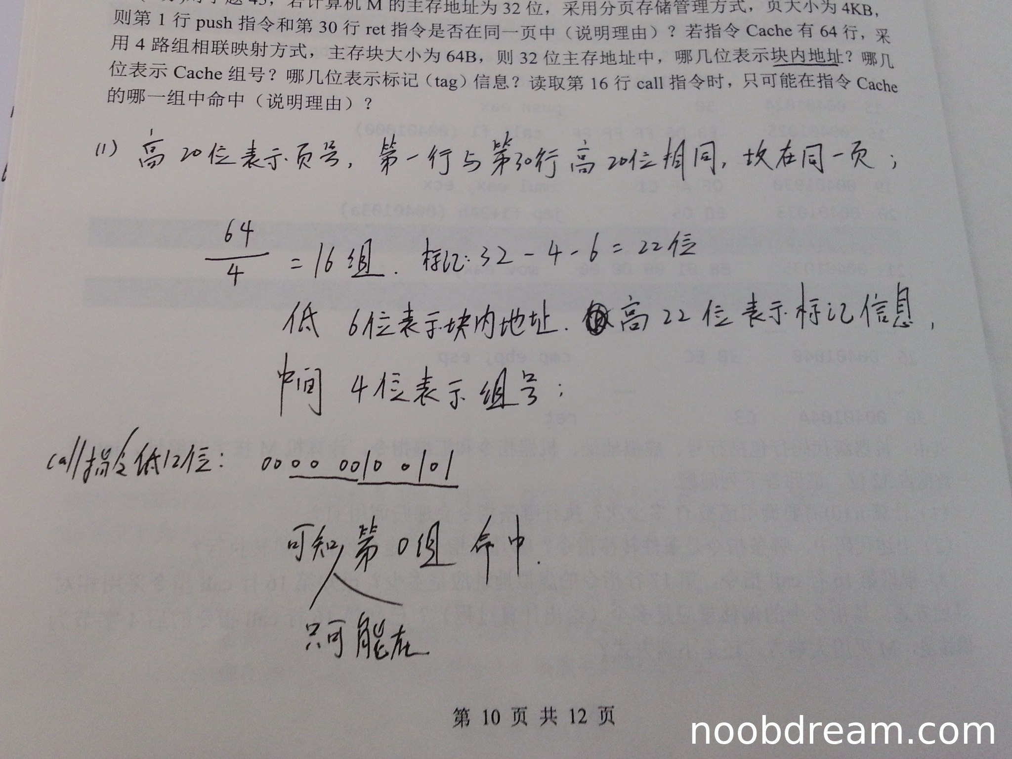 学生正确计算call指令地址的低12位(0000 0010 0101),并从中提取组号(低10位中的中间4位),得出组号为0,与标准答案一致。理由充分。得2分。