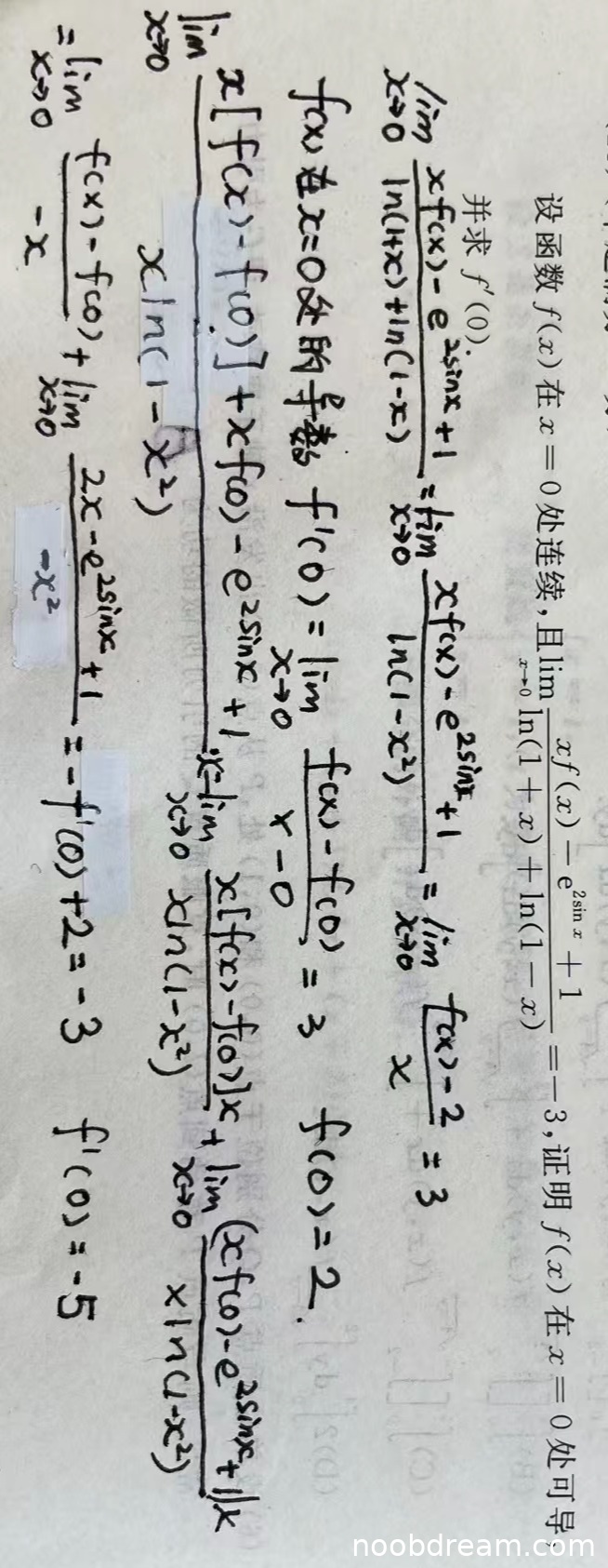 学生作答提供了两次识别结果,但两次结果均存在错误。第一次识别结果中,学生错误地计算了极限,导致最终得到f'(0) = -5,而标准答案为5。具体错误包括:在计算lim_{x→0} [f(0)x - e^{2sinx} + 1]/x时,错误地使用了e^{2sinx}的展开(只展开到一阶项,忽略了高阶项的影响),并且错误地推导出f'(0) + f(0) - 2 = 3,但实际标准答案中该极限应为-5(通过分母-x^2的展开正确推导)。此外,学生错误地得出f(0)=2,但计算f'(0)时却得到负值,与标准答案矛盾。