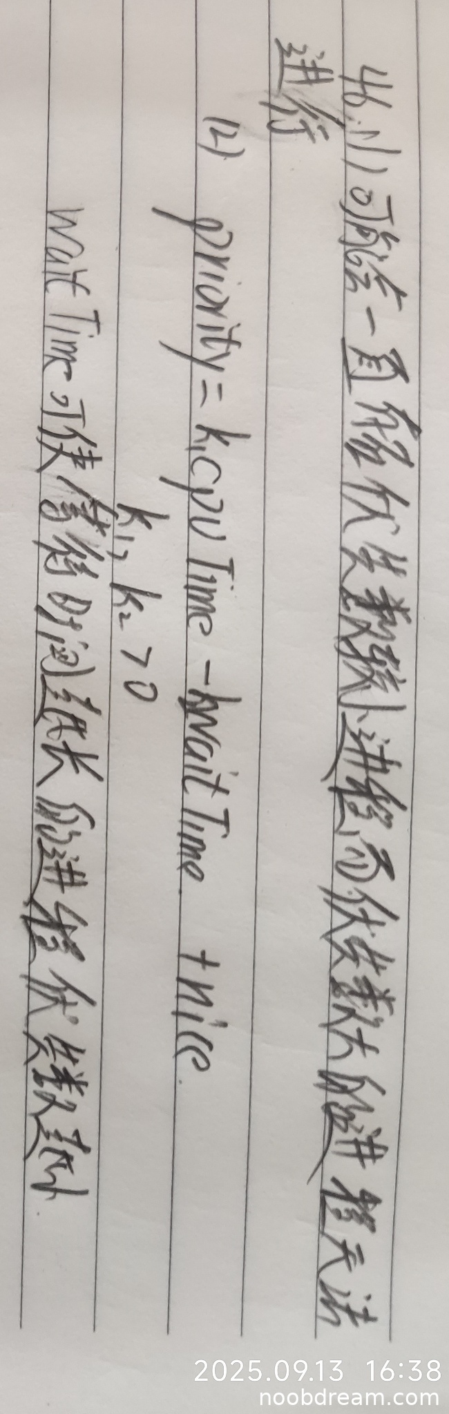 学生给出的动态优先数计算公式为:priority = k1 * CPU Time - k2 * Wait Time + nice,其中k1>0,k2>0。该公式包含了静态优先数nice(1分),利用CPU Time增大优先数(1分),利用Wait Time减小优先数(1分),且说明了Wait Time的作用是使等待时间越长的进程优先级越低(1分),完全符合标准答案要求。因此第(2)问得4分。