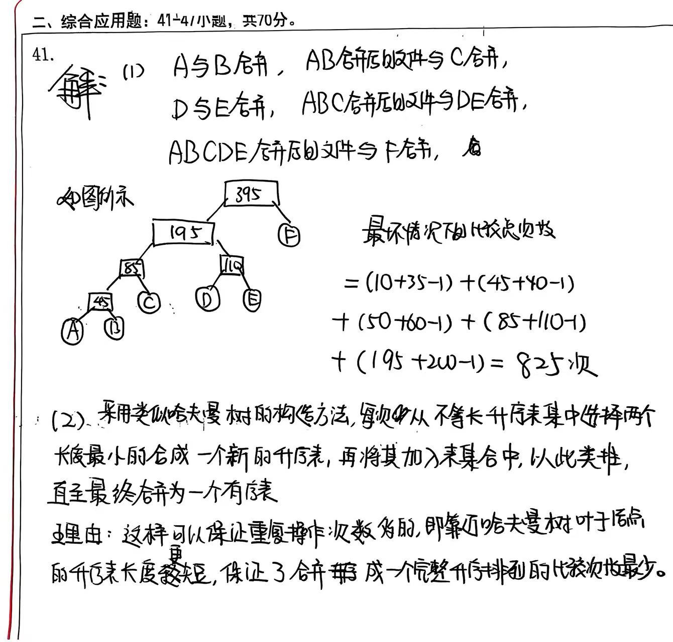 学生给出了完整的合并过程:第1次合并A和B(长度10和35),生成AB(45);第2次合并AB和C(45和40),生成ABC(85);第3次合并D和E(50和60),生成DE(110);第4次合并ABC和DE(85和110),生成ABCDE(195);第5次合并ABCDE和F(195和200),生成最终表。该过程与标准答案(基于哈夫曼树思想)完全一致,且计算最坏情况比较总次数为825次(计算过程正确)。因此,本部分得7分。