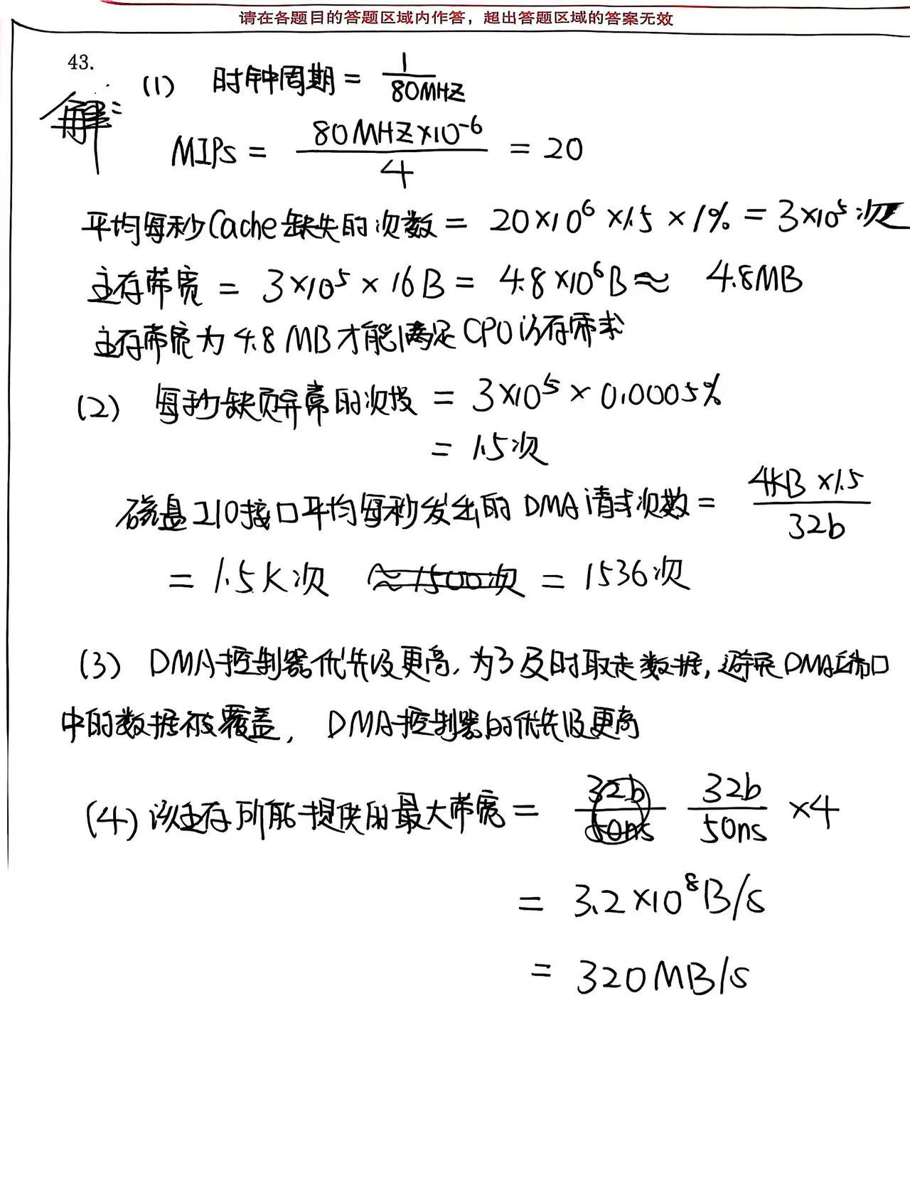 学生正确计算主存最大带宽为320MB/s(2分),计算过程与标准答案一致,因此得2分。