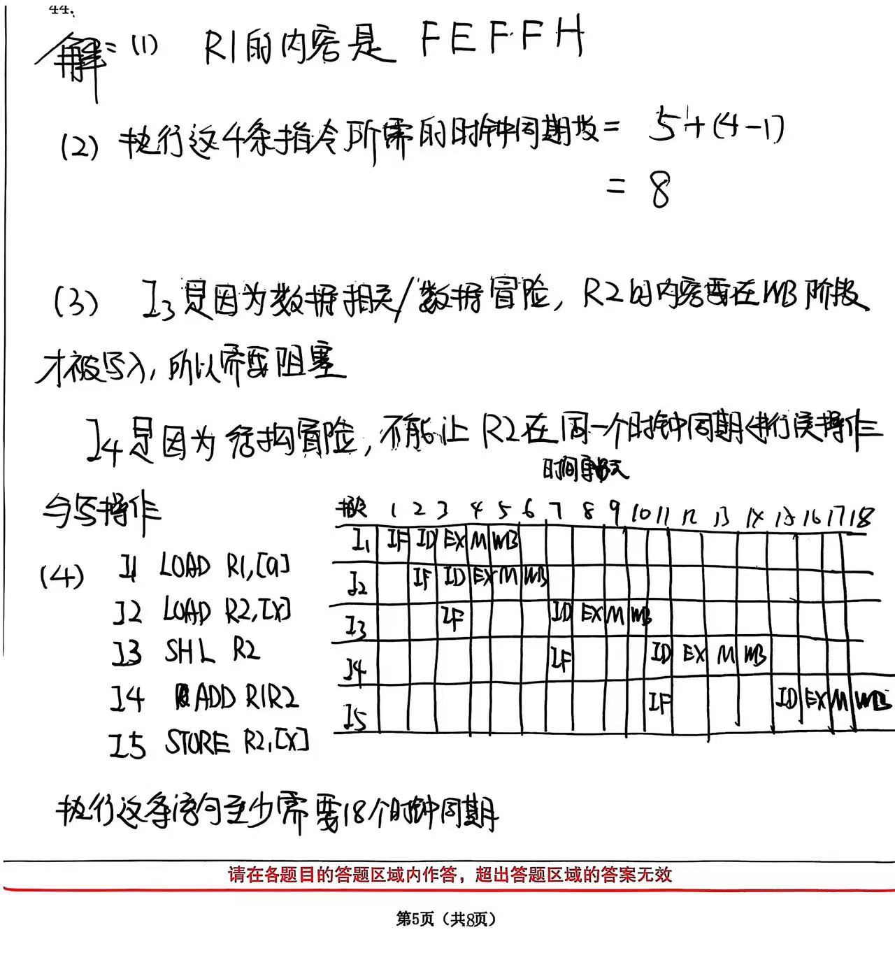 学生指令序列正确(LOAD、SHL、ADD、STORE),但寄存器使用有误:标准答案中应先加载x到R1,再左移R1,最后加a;学生答案中加载x到R2并左移R2,但STORE时却存R2(应为左移后的R1与a相加的结果)。逻辑错误:STORE指令应存储最终结果到[x],但学生序列中ADD结果在R1,STORE却存R2,导致结果错误。指令序列部分正确(2分)。时钟周期数学生答18,但标准答案为17(因流水线阻塞分析不同)。学生未给出执行过程示意图,且周期计算错误。综合扣分:指令序列逻辑错误扣2分(STORE错误),周期数错误扣1分,缺示意图扣2分(标准答案中示意图占3分)。本题得2分(指令部分正确)。