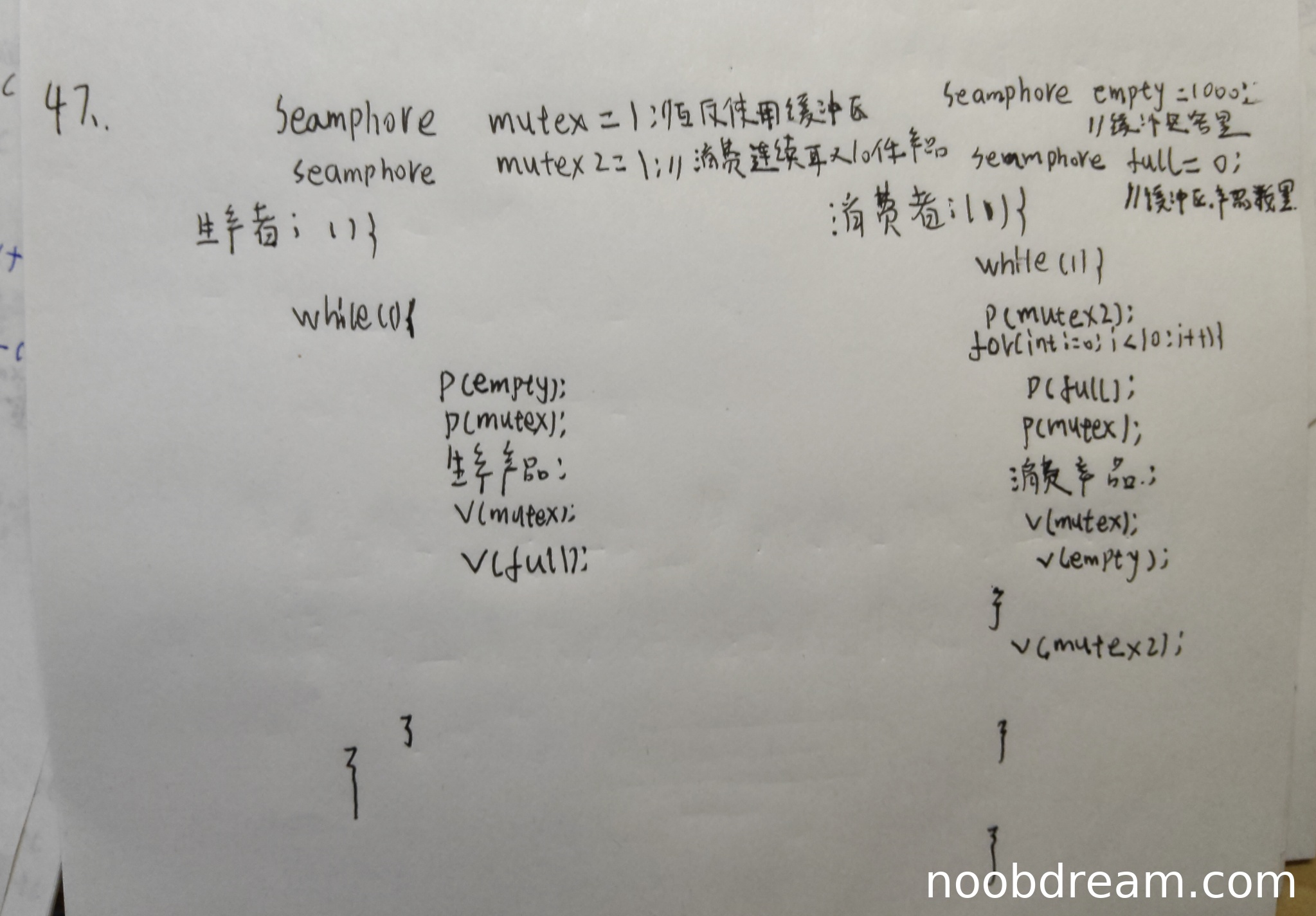 (4)消费者互斥操作(满分1分):得分1分。理由:学生使用mutex2控制连续取10件产品,P(mutex2)在for循环外,V(mutex2)在循环后,正确实现了连续取10件期间其他消费者阻塞,符合要求。