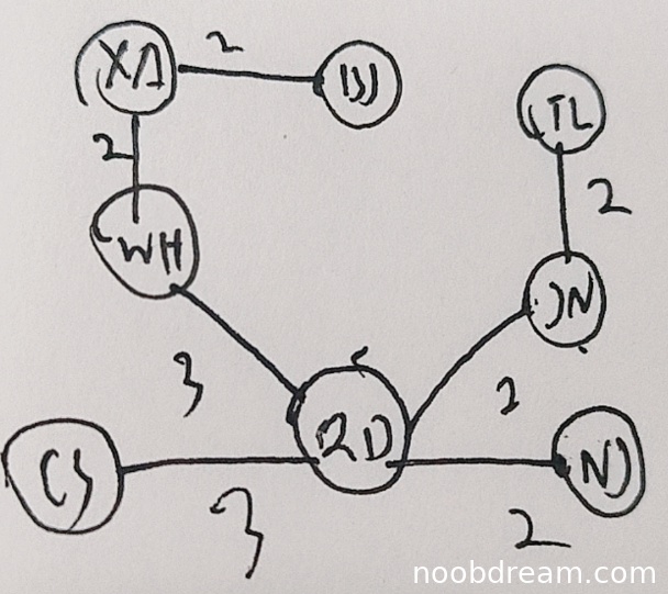 学生作答中给出了总费用16,这与标准答案一致,说明计算正确。但学生没有明确给出所有可能的最经济方案(即两种最小生成树方案),且识别出的节点名称存在错误(如XM应为XA,ZD应为QD,LTL应为TL),这些错误可能是识别问题导致的误写。由于题目要求给出所有可能方案,学生仅隐含了一种方案(通过图形展示),未完整回答,因此扣1分。得分:3分。