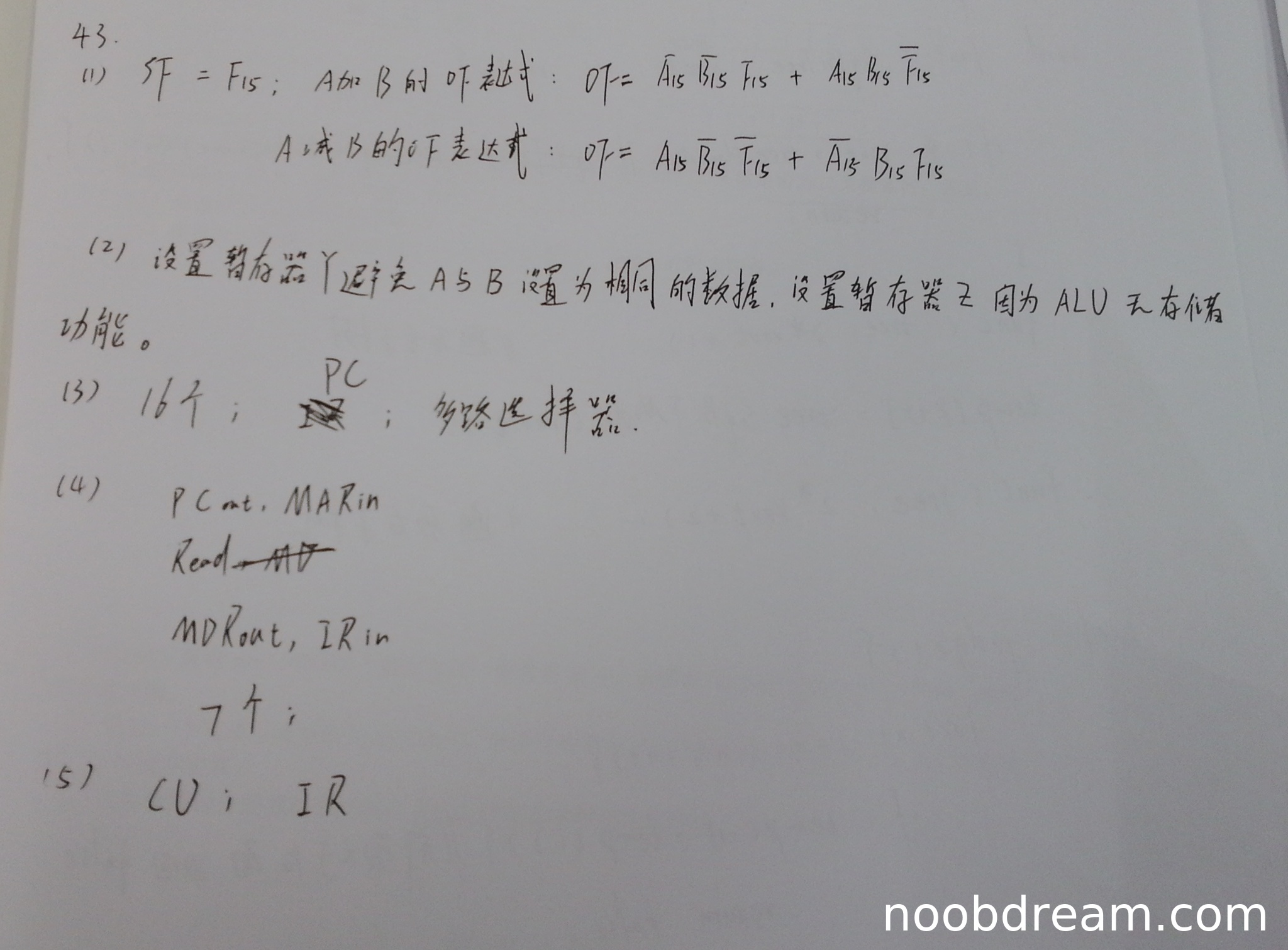 学生第一次识别结果中,SF = F15 正确(1分);A加B的OF表达式为 OF = A15 B15 F15 + A15 B5 ¬F15,其中B5应为B15,且表达式错误(标准为 OF = A15·B15·¬F15 + ¬A15·¬B15·F15),扣0.5分;A减B的OF表达式为 OF = A15 ¬B15 ¬F15 + ¬A15 B15 F15,正确(1分)。第二次识别结果中,A加B和A减B的表达式均错误(重复写同一项),但根据第一次识别结果,A减B正确,故综合给分:SF正确1分,A加B部分正确0.5分(表达式有误但形式接近),A减B正确1分。总分2.5分,但问题满分3分,按比例扣分后得2分(因A加B错误较明显)。