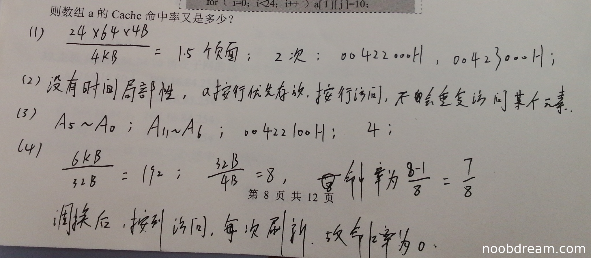 学生正确计算数组a占用192个主存块(得1分)。第一问命中率计算正确(7/8=87.5%,得2分)。第二问调换循环后,学生错误认为命中率为0(实际应为87.5%,因为按列访问时仍存在Cache组内重用,但学生未考虑主存块大小与访问步长的关系)。因此,第二问命中率错误扣2分。本小题得3分(满分5分)。