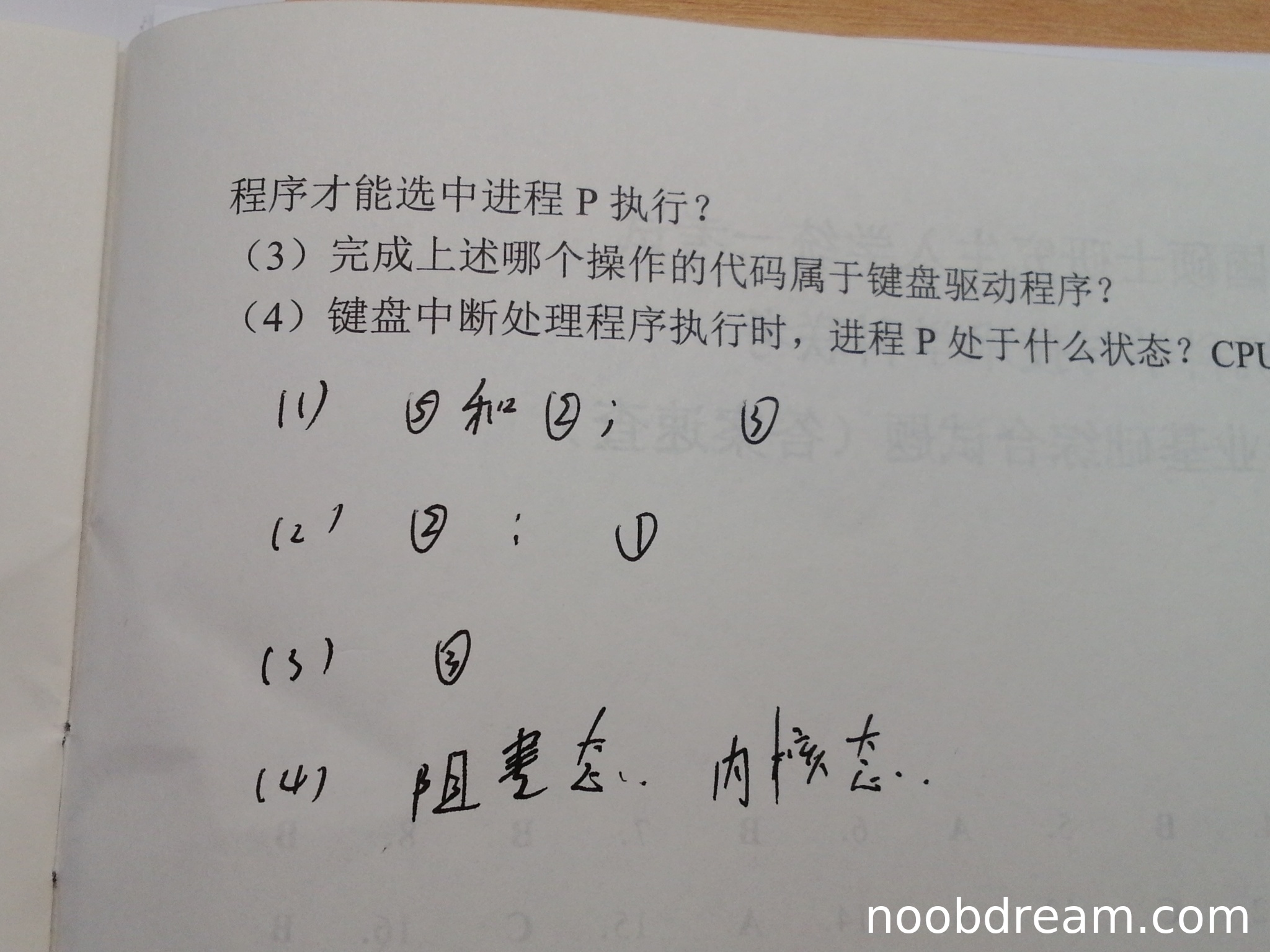 学生两次识别答案均为“③;①”。标准答案要求CPU一定从P切换走的操作是②(插入阻塞队列),调度程序才能选择P执行的操作是①(插入就绪队列)。学生答“③”和“①”,其中“①”正确,但“③”错误(应为②)。部分正确,扣1分。