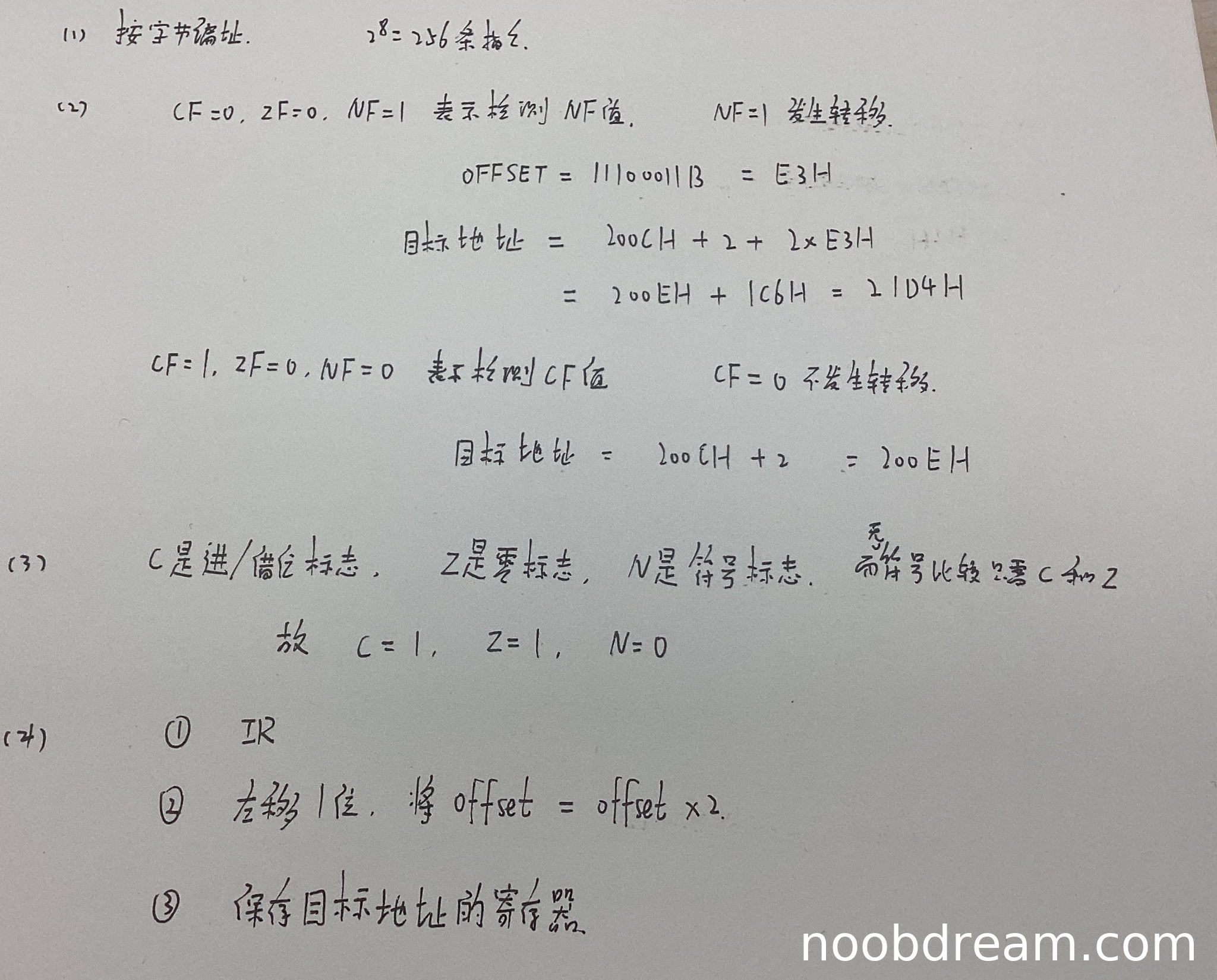 学生回答“按字节编址”正确(1分),但“2^8=256条指令”错误,因为偏移量OFFSET为8位补码,范围是-128~127,向后最多跳转127条指令(2分)。学生误将偏移量范围理解为无符号数,导致逻辑错误,扣2分。本题得1分。