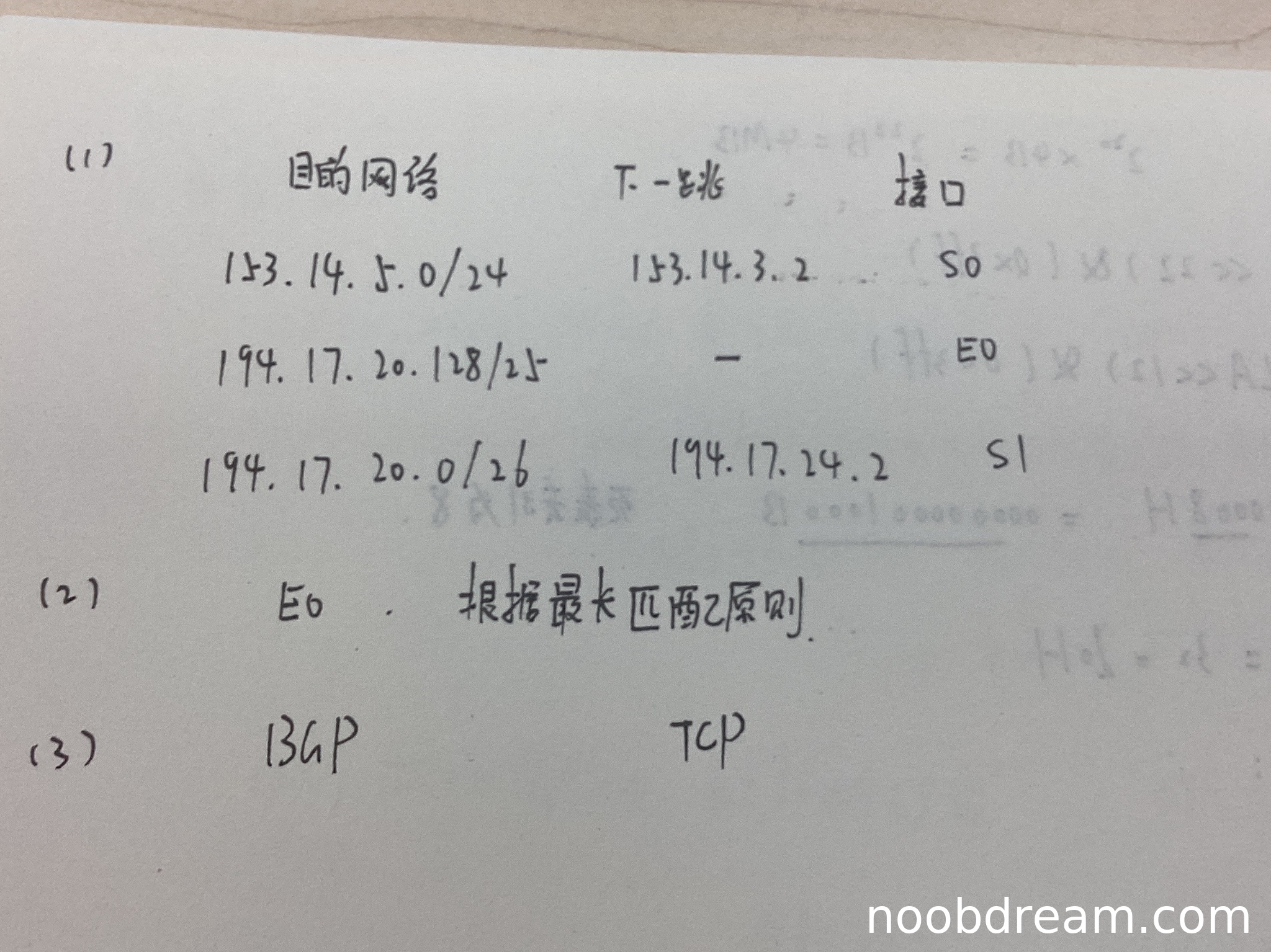- 第三个路由项:目的网络194.17.20.0/26,下一跳194.17.24.2,接口S1。此路由项存在错误:聚合目的网络应为194.17.20.0/23(覆盖194.17.20.0/25和194.17.21.0/24),但学生写成了194.17.20.0/26,这会导致194.17.21.0/24子网无法被覆盖(因为/26掩码仅覆盖194.17.20.0-194.17.20.63),且下一跳和接口正确。由于目的网络错误,此路由项不得分(但下一跳和接口正确部分不单独给分)。