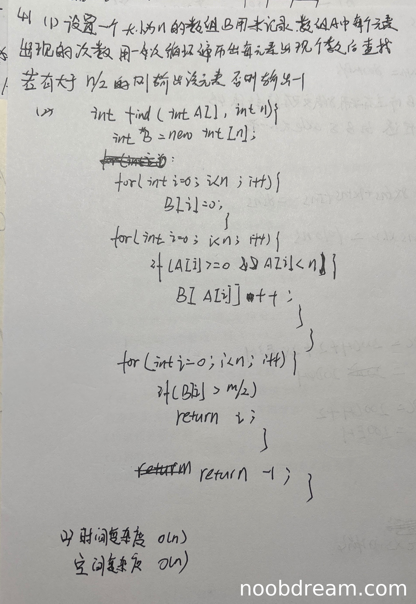 学生代码实现中存在逻辑错误:在第二个循环(统计次数)中,学生使用了一个双层循环(第一次识别)或单层循环(第二次识别)。第二次识别的代码是正确的单层循环,但第一次识别有误(双层循环会导致错误,但第二次识别已纠正)。根据第二次识别结果,代码逻辑正确:初始化数组B为0,遍历A数组,对每个A[i]在B中对应位置计数,最后检查B中是否有元素计数大于n/2。但代码中有一个冗余条件判断(A[i] >= 0 && A[i] < n),题目已说明0≤a_i (3)得分及理由(满分2分) 学生正确分析了时间复杂度为O(n)和空间复杂度为O(n),与代码实现一致。得2分。 题目总分:4+7+2=13分